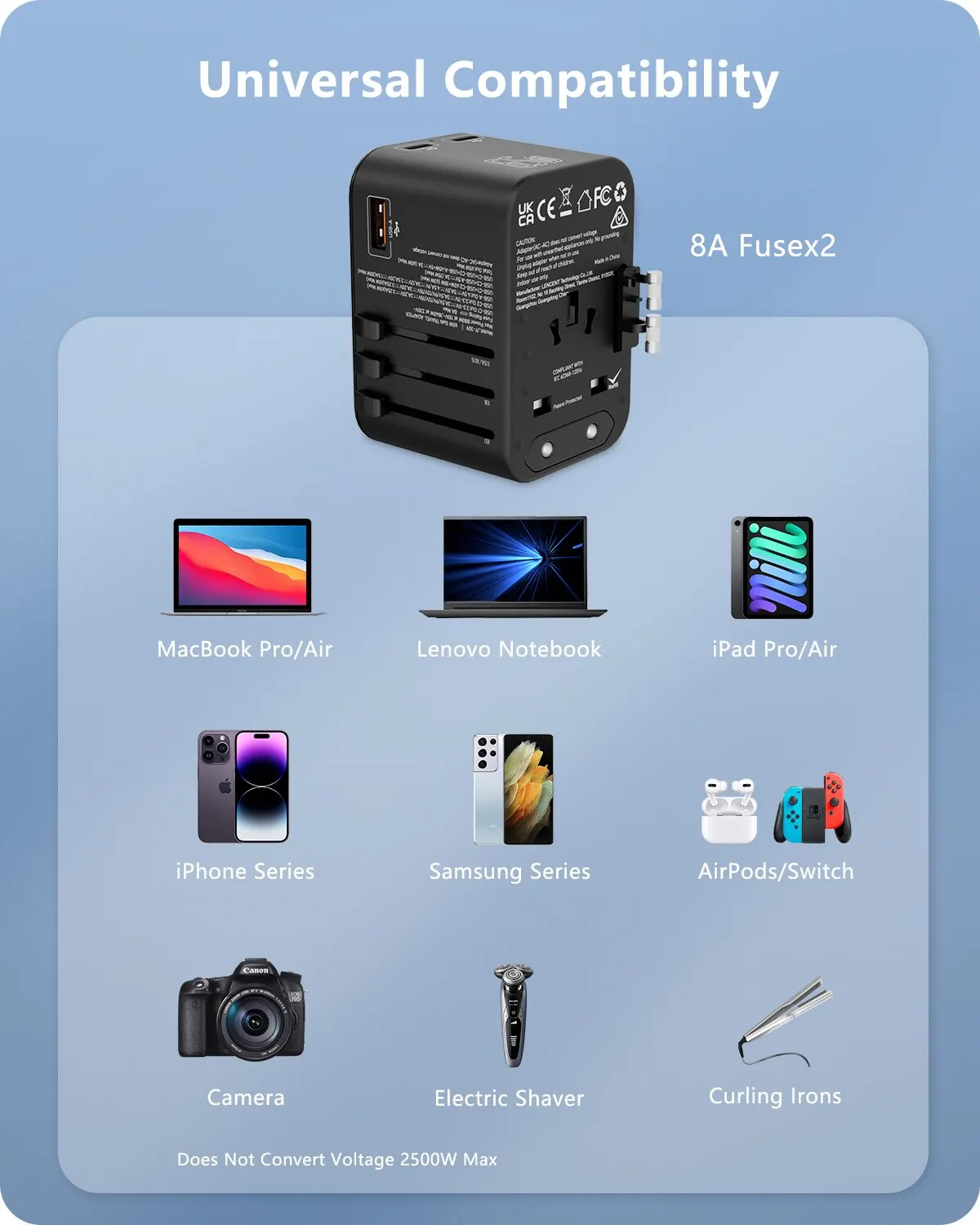 Adaptador USB portátil (4,9*5,1*7,6 cm) y liviano (194g) con enchufes intercambiables UK / US / EU / AUS y compatibilidad internacional de voltaje, fácil de transportar, le permite cargar varios dispositivos simultáneamente en cualquier lugar cuando lo desee. Funciona en más de 200 países y es compatible con casi todos los dispositivos USB.