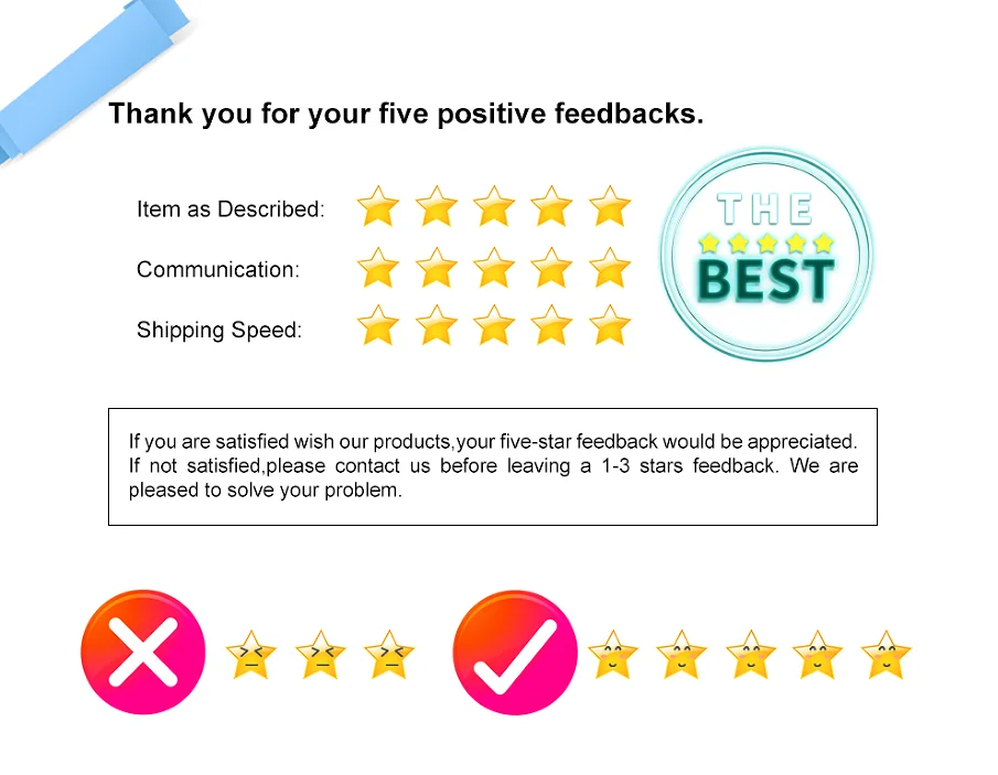 Estamos haciendo todo lo posible para satisfacer a nuestros clientes. Esperamos sinceramente que nos puedas dejar un comentario positivo. Por cualquier motivo que no esté satisfecho con su pedido, póngase en contacto con nosotros a través de (mis mensajes) o (haga preguntas al vendedor), gerente comercial antes de dejar un comentario neutral o negativo. Haremos todo lo posible para resolver cualquier problema y satisfacer sus necesidades.