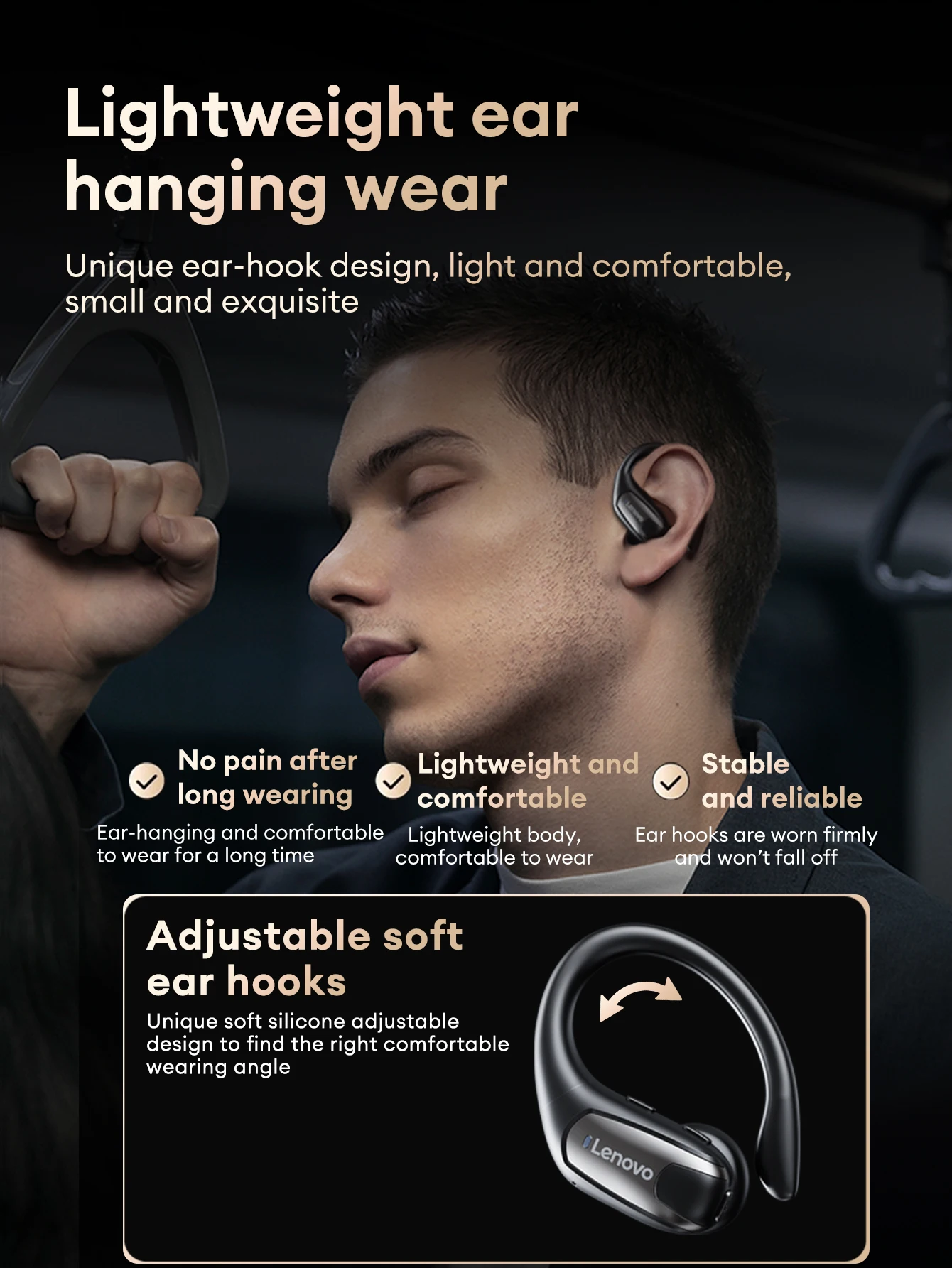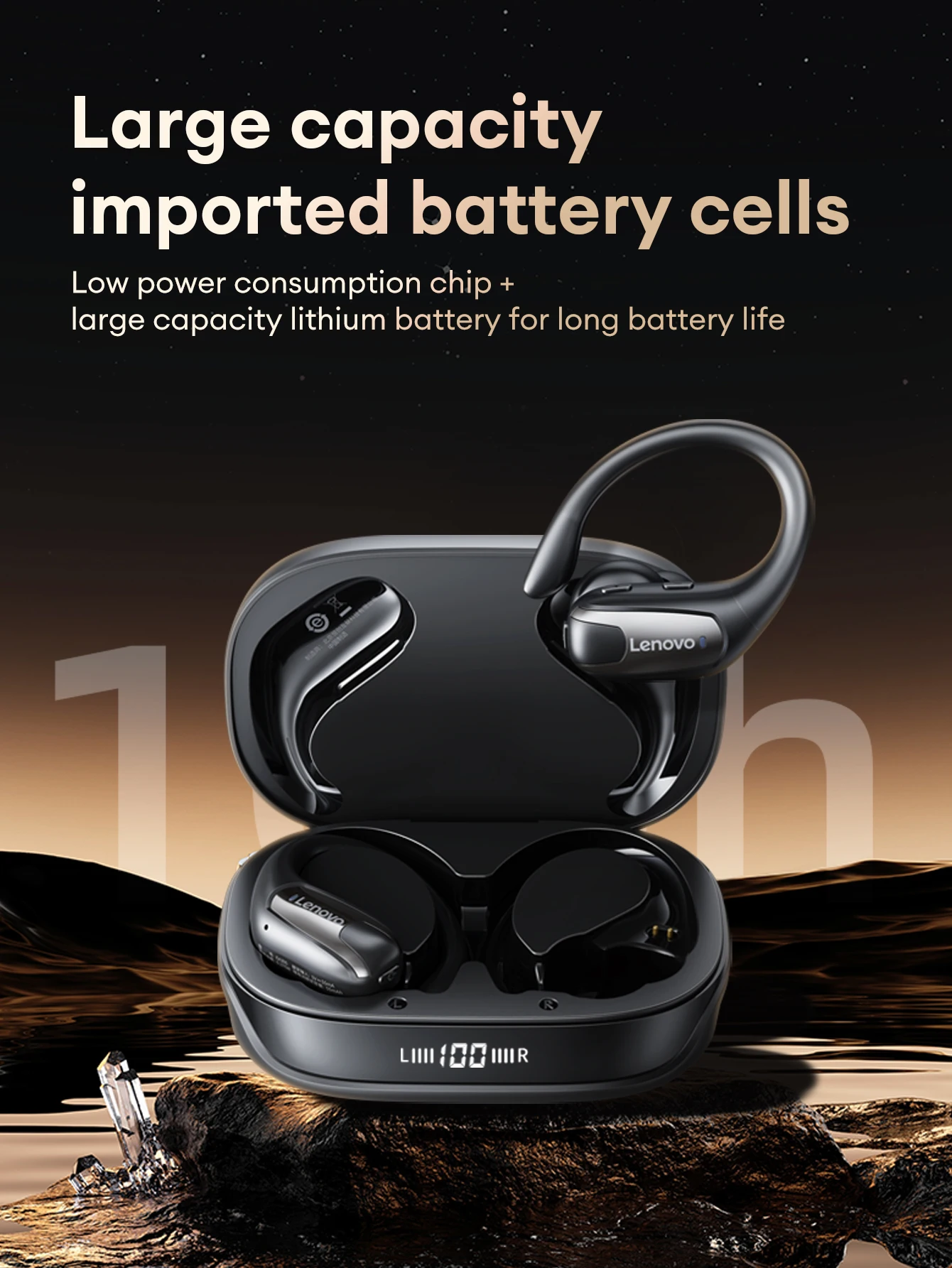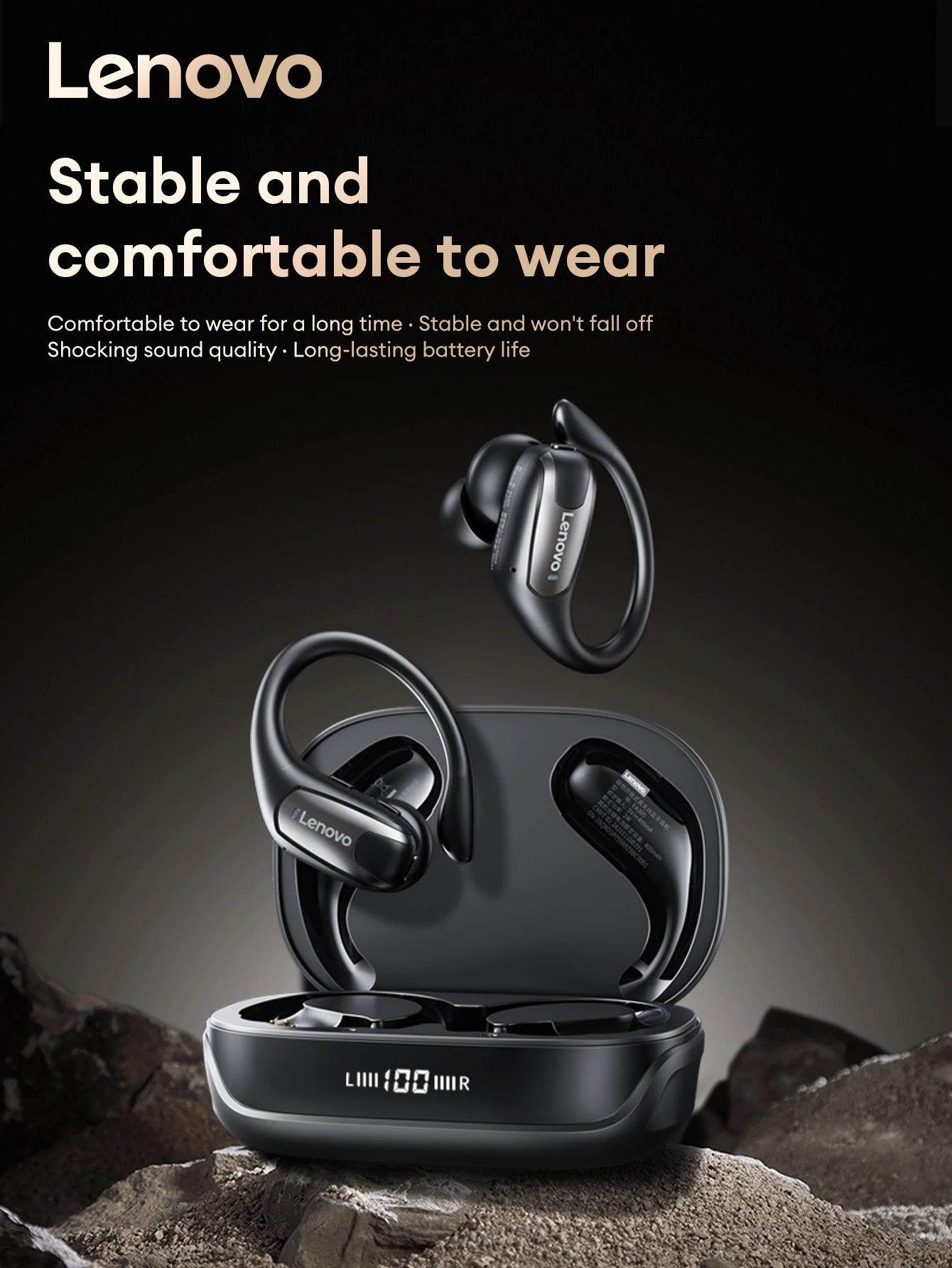 Comfortable to wear for a long time . Stable and won't fall off Shocking sound quality . Long-lasting battery life