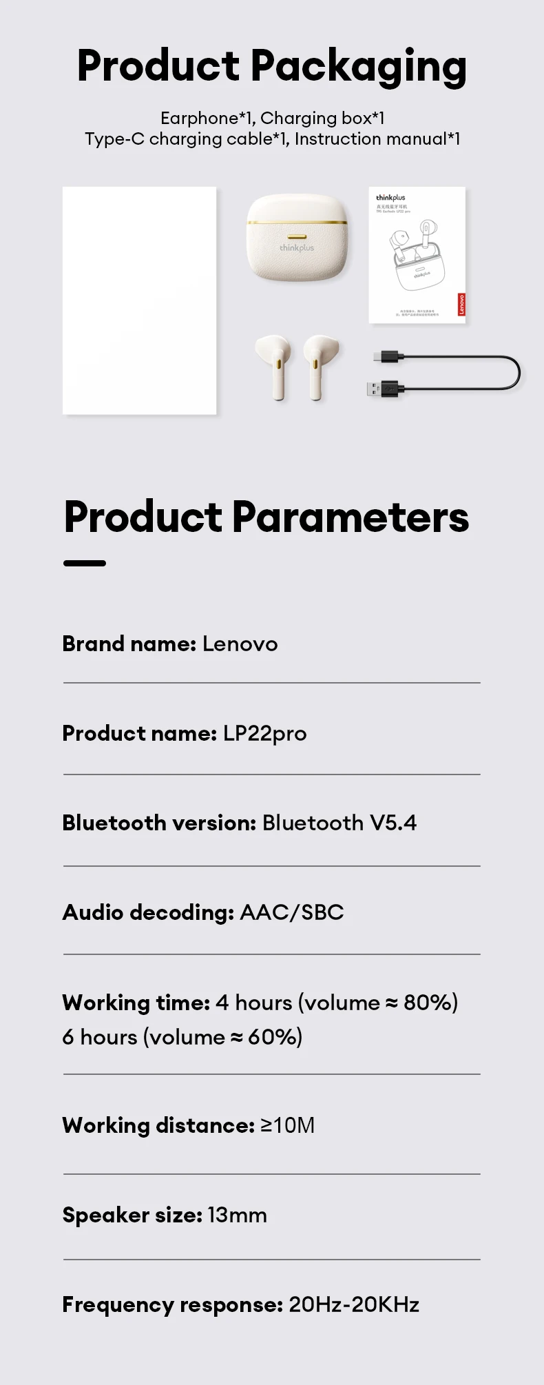 Lenovo LP22 Pro Auriculares inalámbricos Bluetooth Sonido HiFi Reducción de ruido de baja latencia