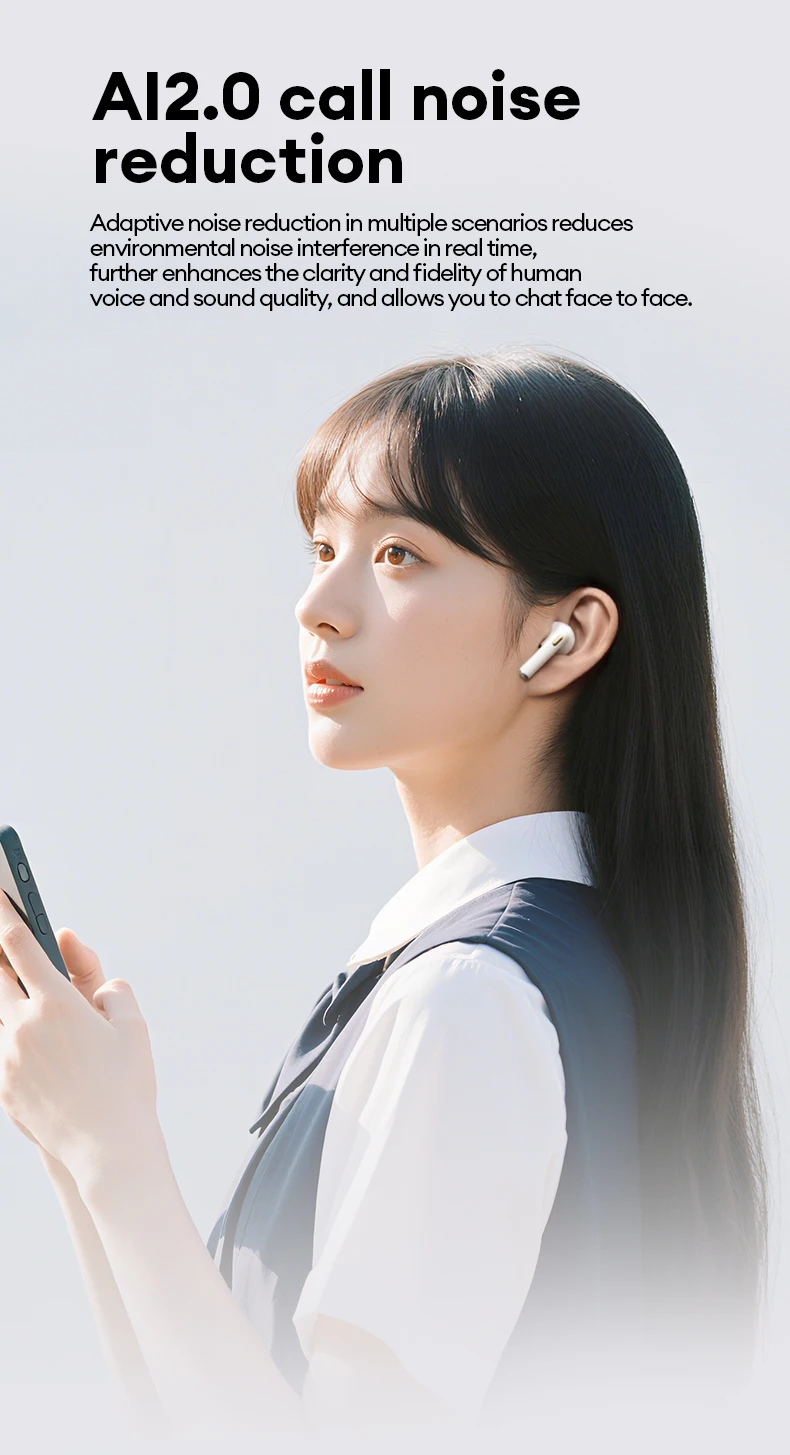 4.[ENC Llamada clara]:Matriz de micrófono dual + algoritmo AI aísla la voz del ruido ambiental de hasta 40 dB.Escuche claramente en metros o cafeterías: no más gritos sobre el caos de fondo.