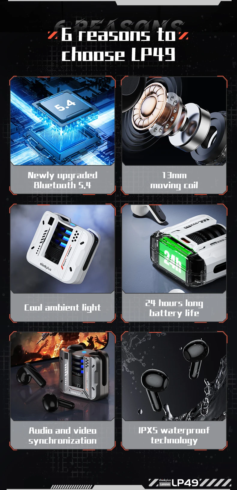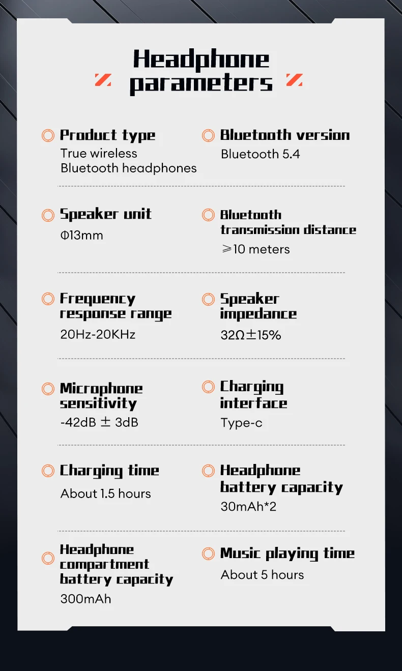 1.[Bluetooth 5.4 / HD Decoding]:2.[Dynamic Driver / Balanced Audio]:3.[24-Hour Battery Life / Fast Charging]: 4.[55ms Ultra-Low Latency / Audio-Video Sync]: 5.[IPX5 Waterproof / Smart Touch]:6.[Ergonomic Design / Device Compatibility]:Specification: