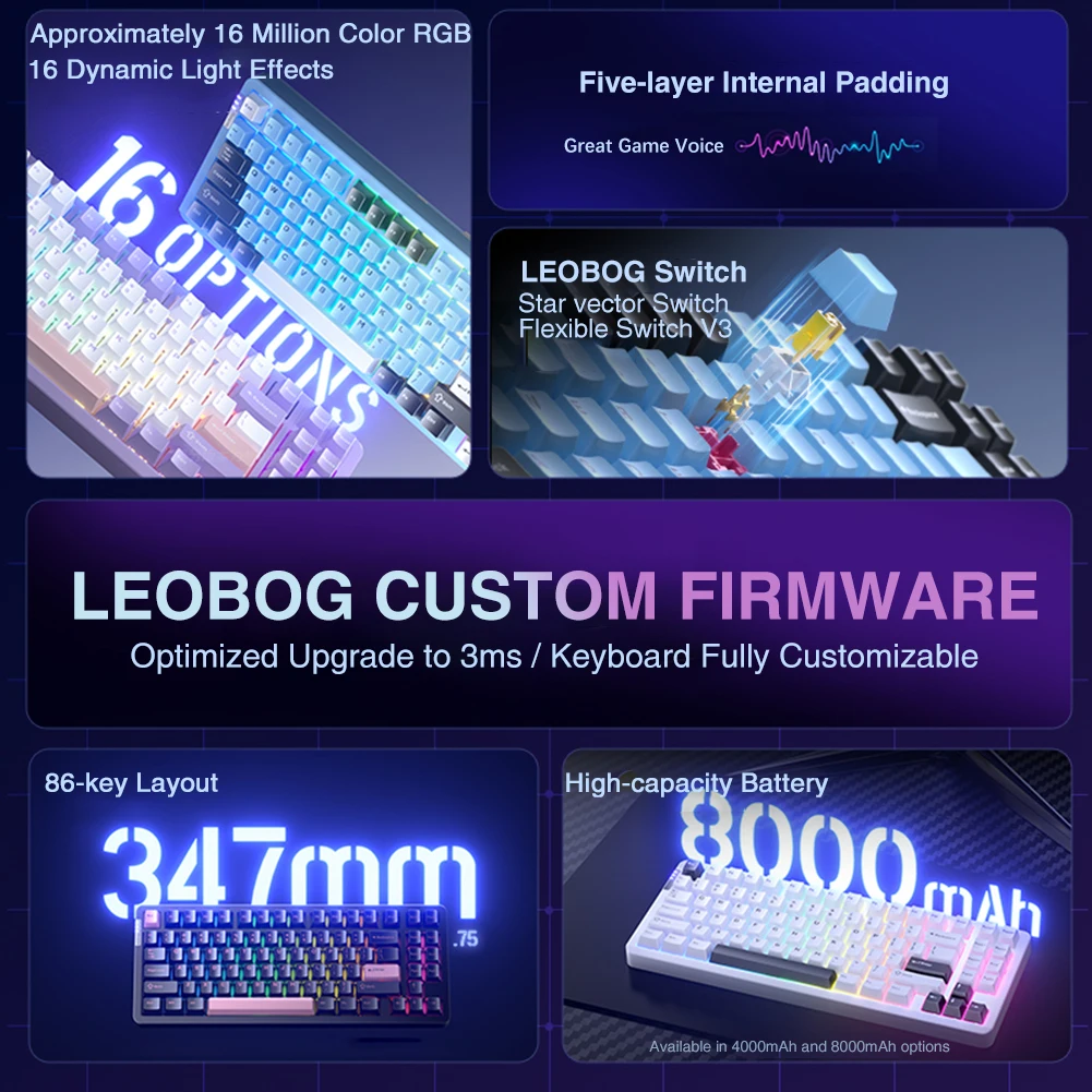 LEOBOG Hi86 Aluminum Custom Mechanical Keyboard Tri-Mode Wireless Gasket 75% Programmable Gaming Keyboard RGB Backlit 8000mAh