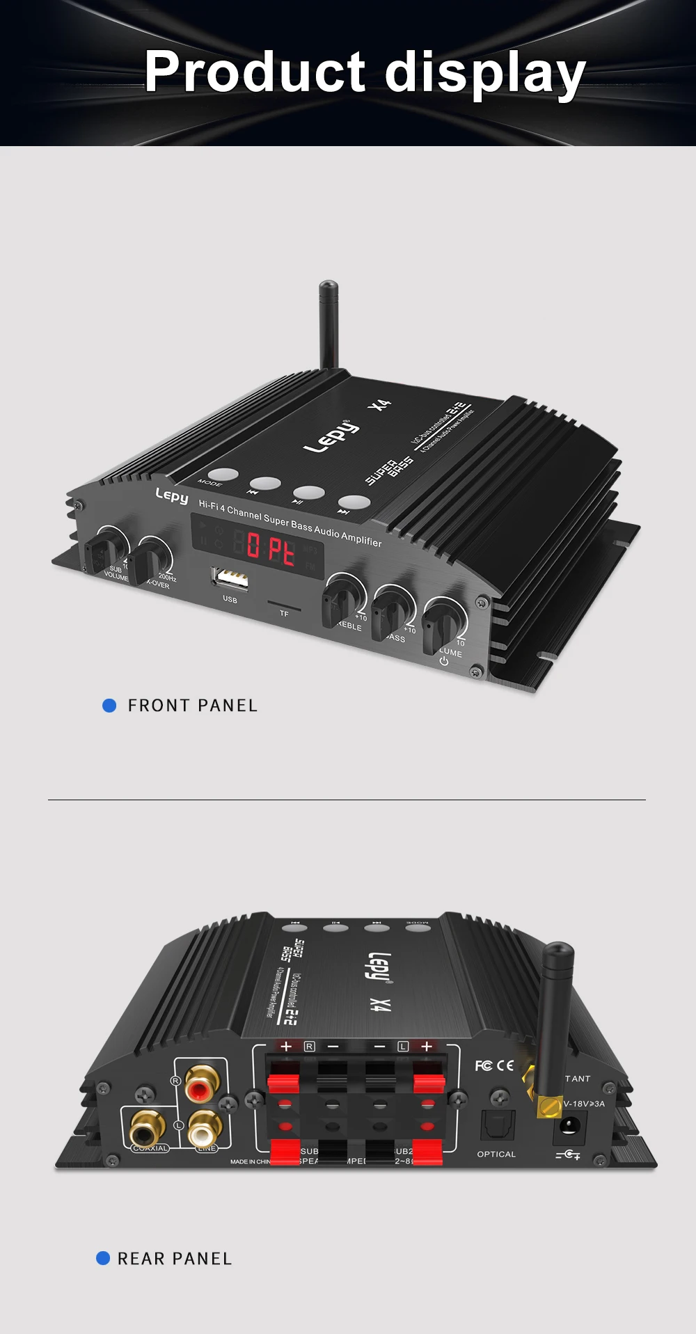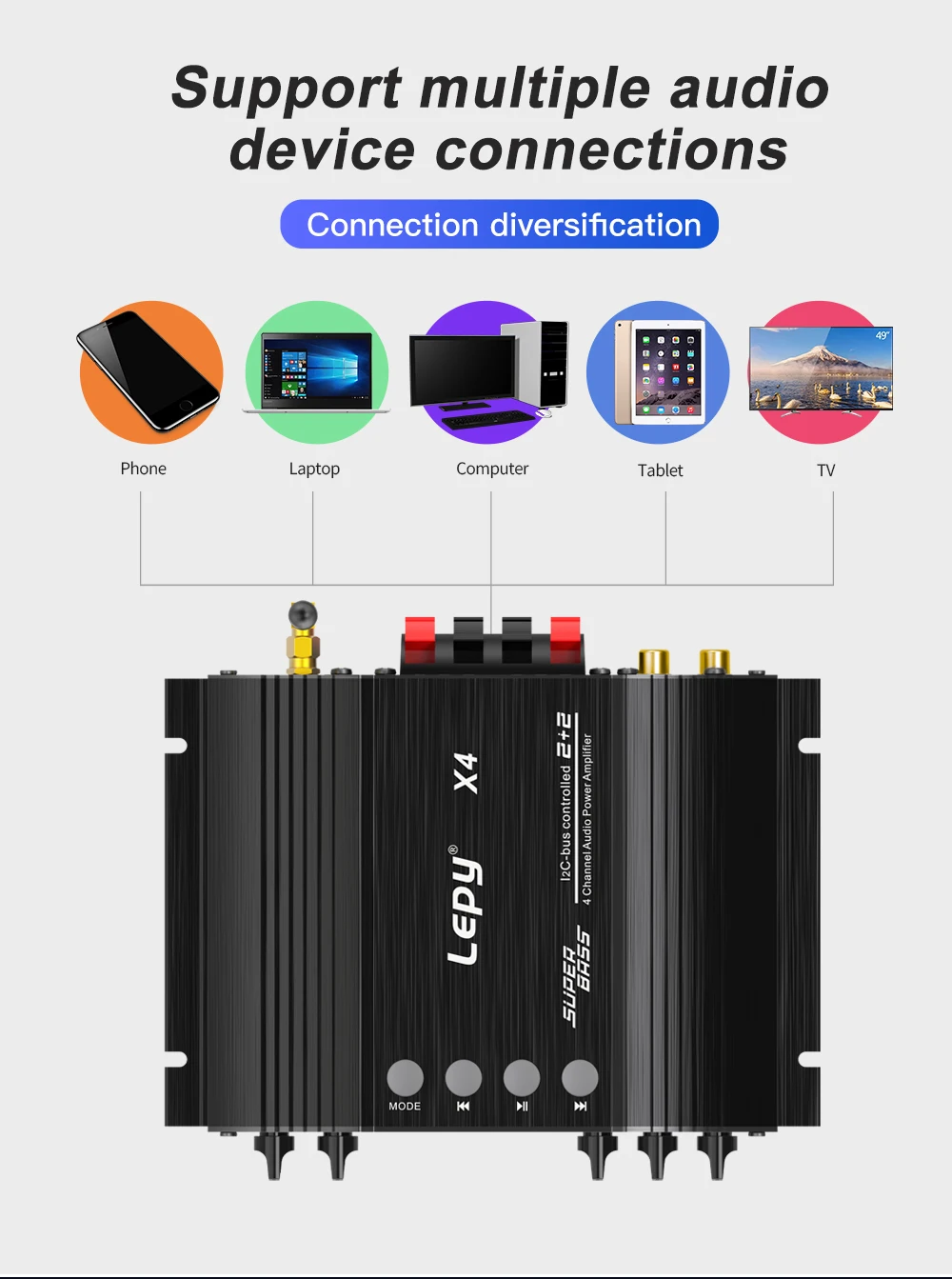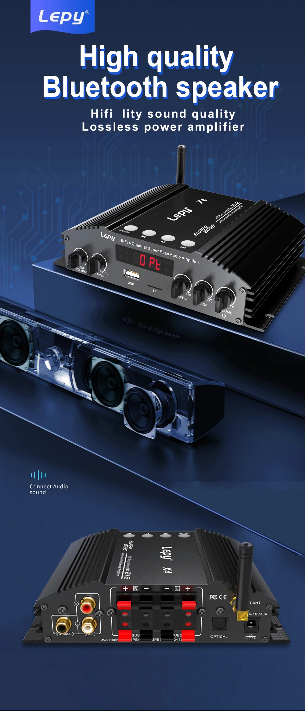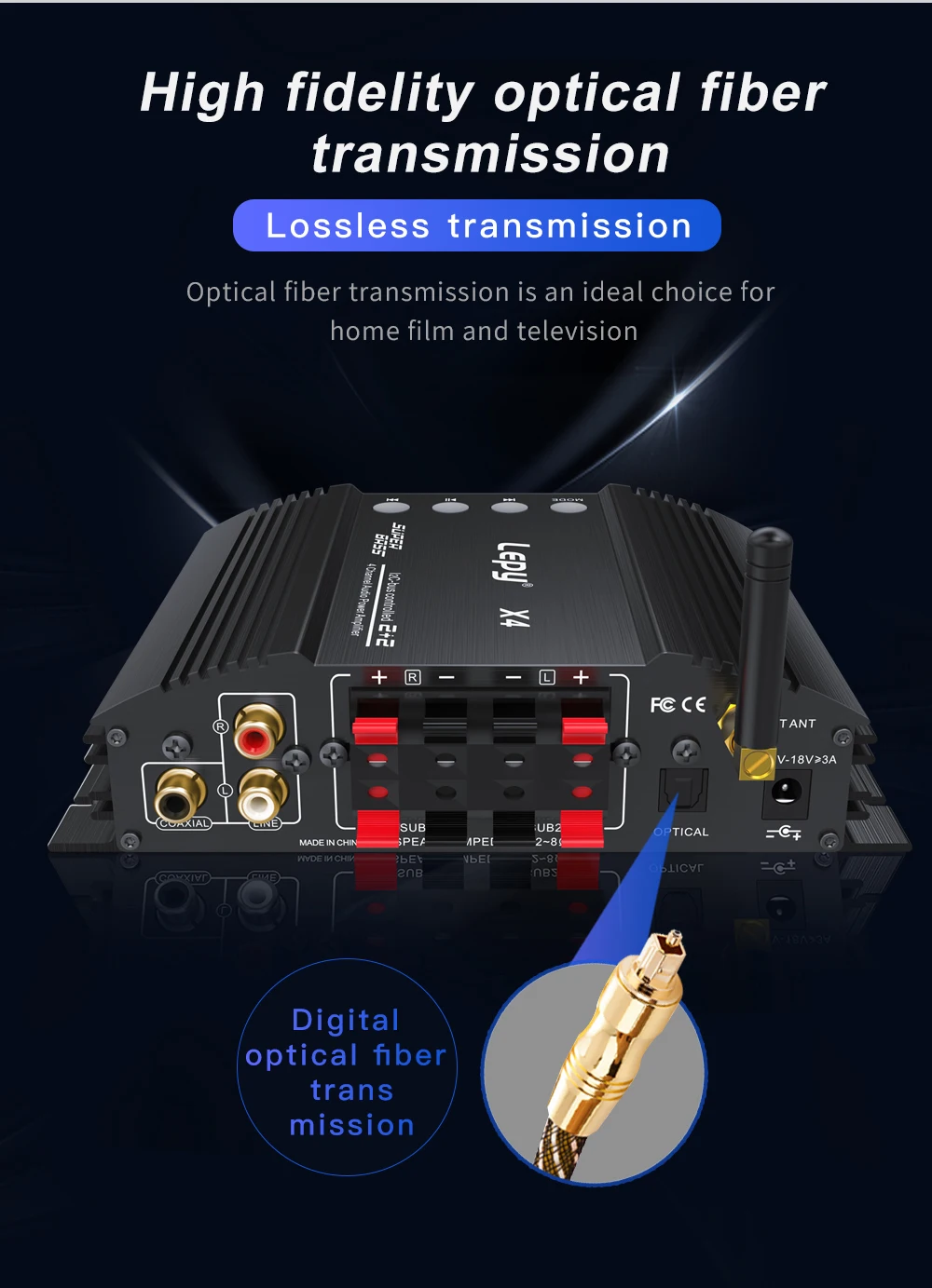 LEPY X4 HIFI 4 canales Bluetooth 5.0 amplificador de potencia, fibra óptica, entrada Coaxial, amplificador de Audio 2.1 salida de subwoofer doblePropiedades del producto: