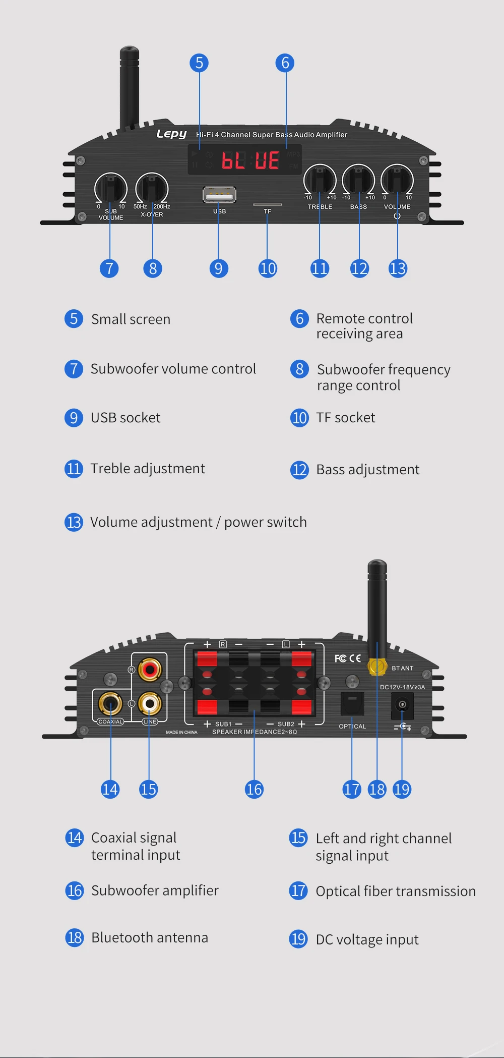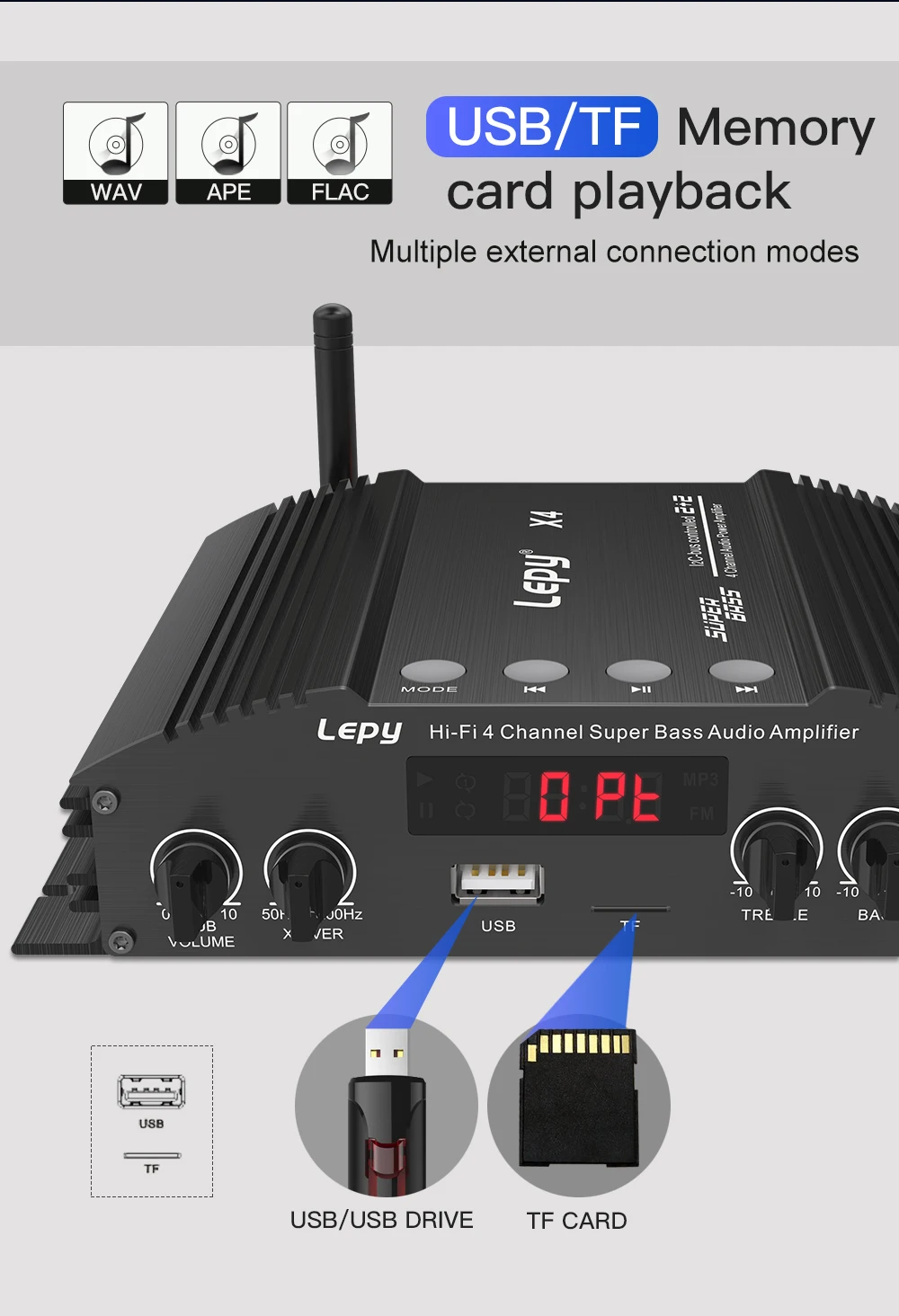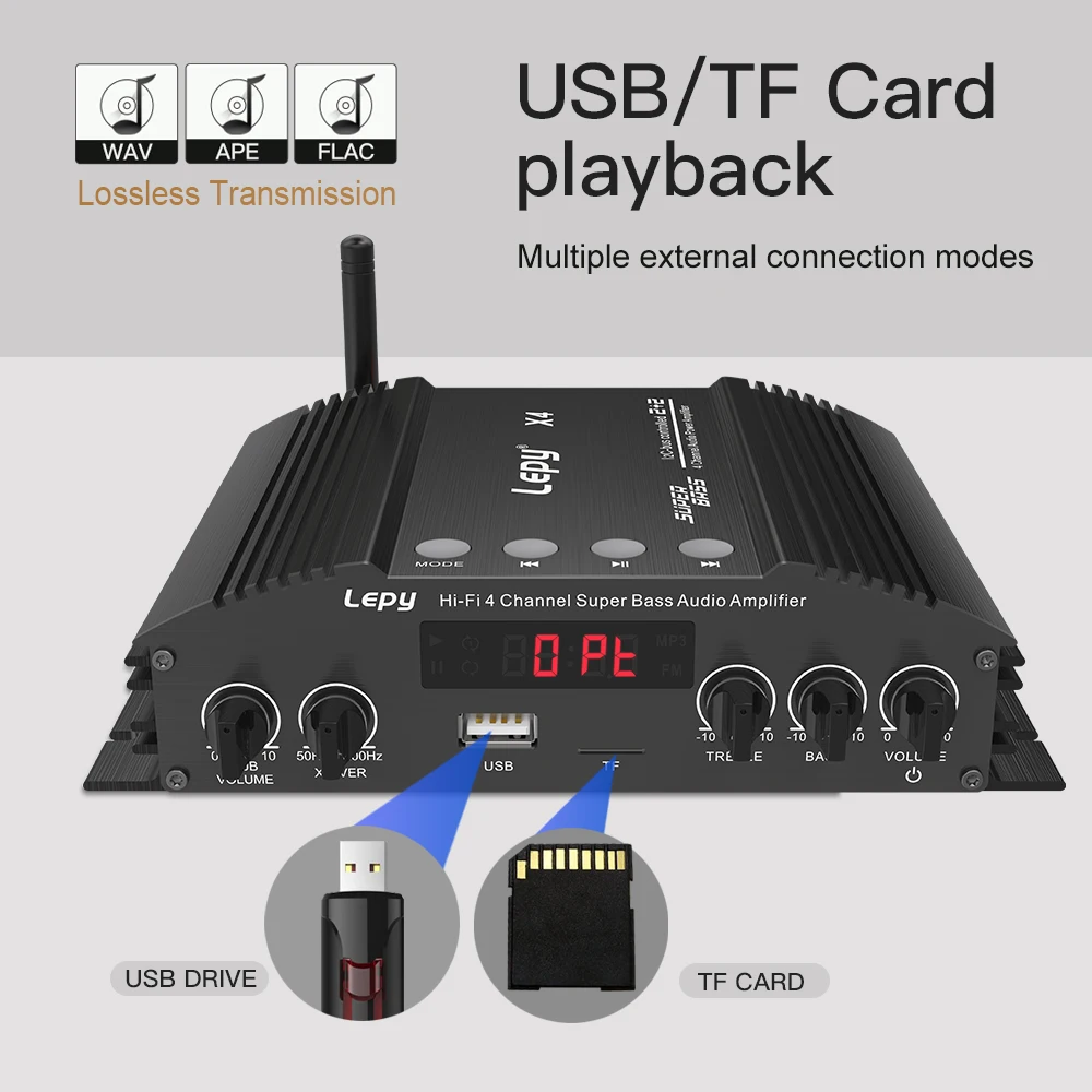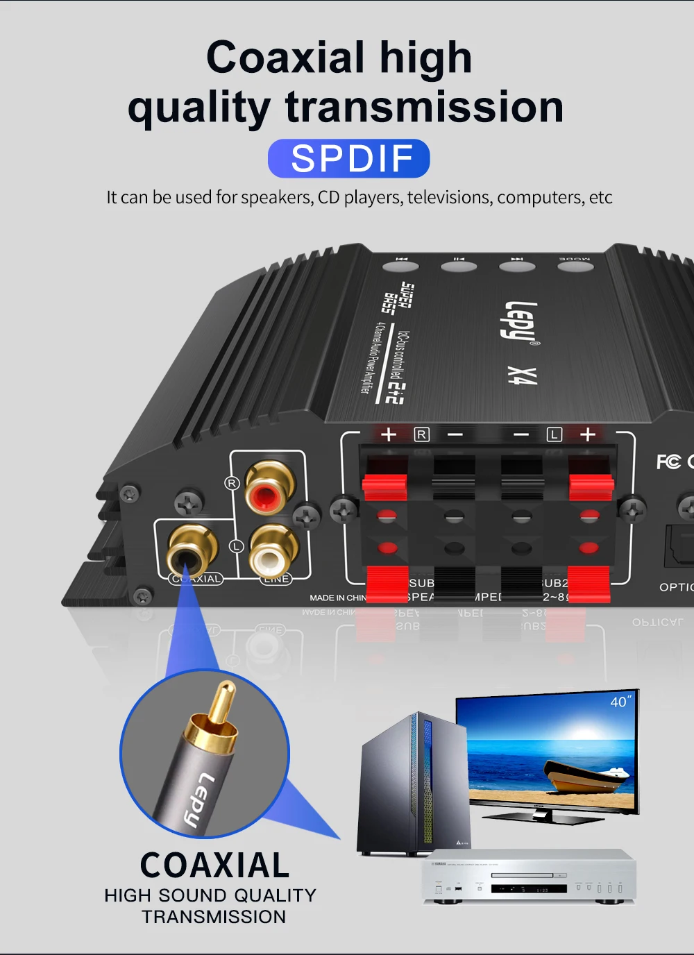 LEPY X4 HIFI 4 canales Bluetooth 5.0 amplificador de potencia, fibra óptica, entrada Coaxial, amplificador de Audio 2.1 salida de subwoofer doblePropiedades del producto: