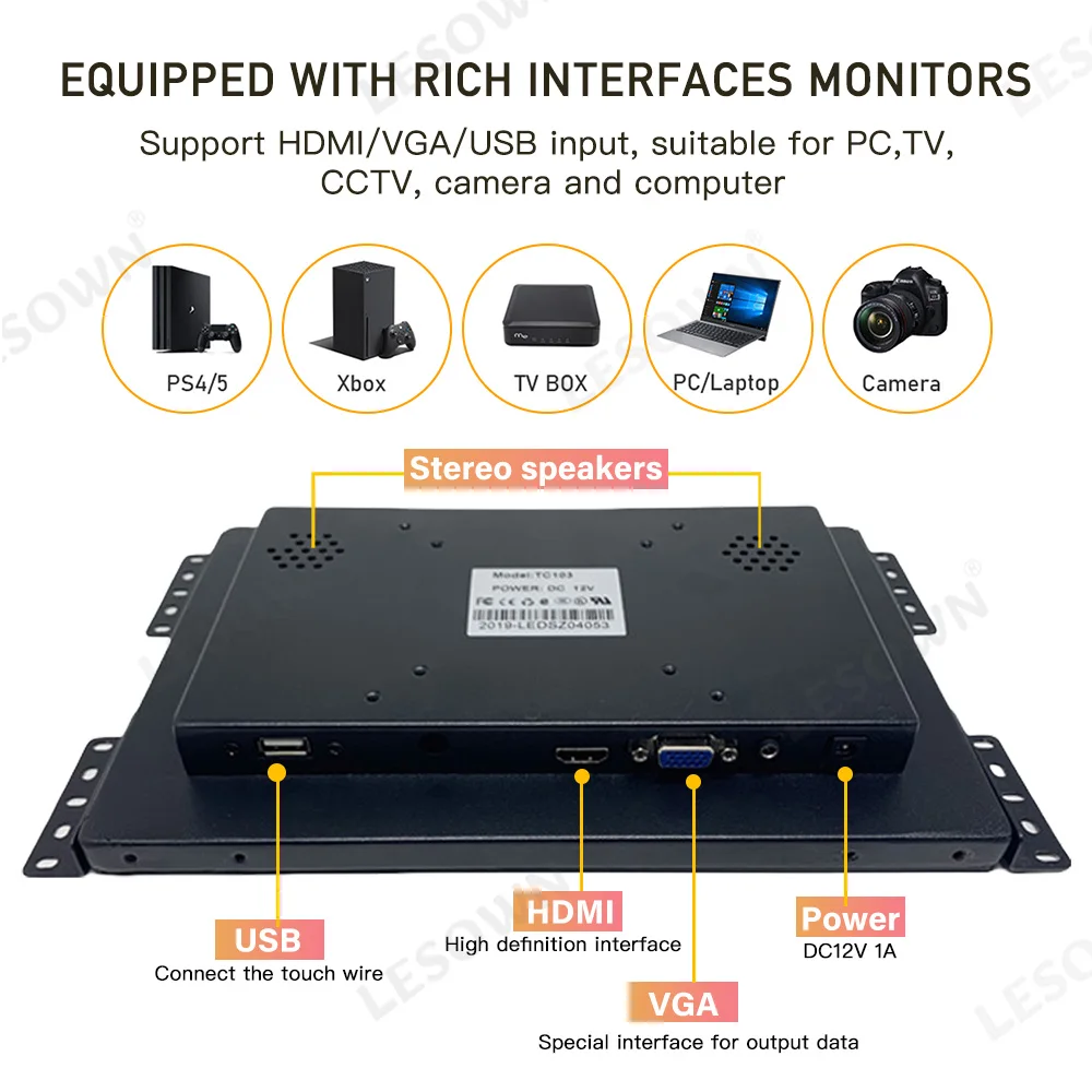 LESOWN 10,1 pulgadas 1280x800 pantalla de alto brillo 300cd/m2 / 600-1000cd/m2 Monitor integrado pantalla de montaje en Panel para PC TV CCTV
