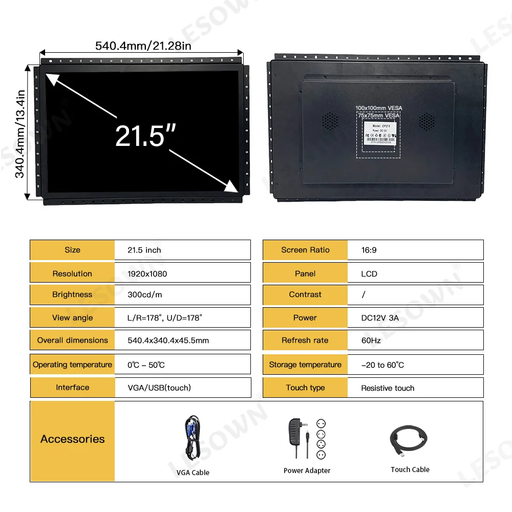 Comprar LESOWN Pantalla táctil de marco abierto de 21,5 pulgadas Industrial 1920x1080 LCD 16:9 Monitor de montaje en panel con VGA/USB (táctil) para sistemas POS