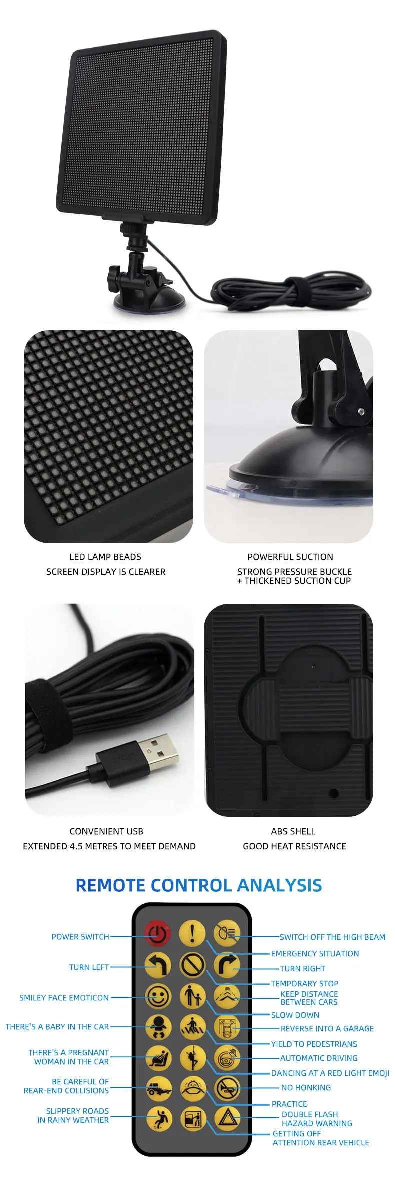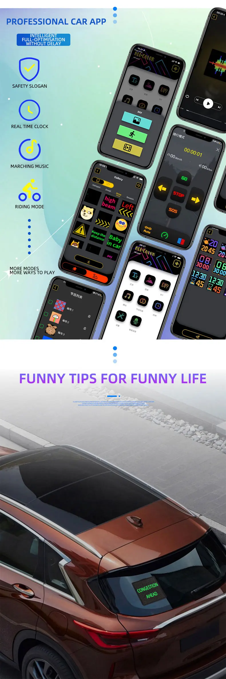 • Panel de píxeles de matriz:Equipado con un panel Matrix Pixel, este letrero LED garantiza una pantalla vibrante y cautivadora en el parabrisas, mejorando la estética interior de su automóvil.