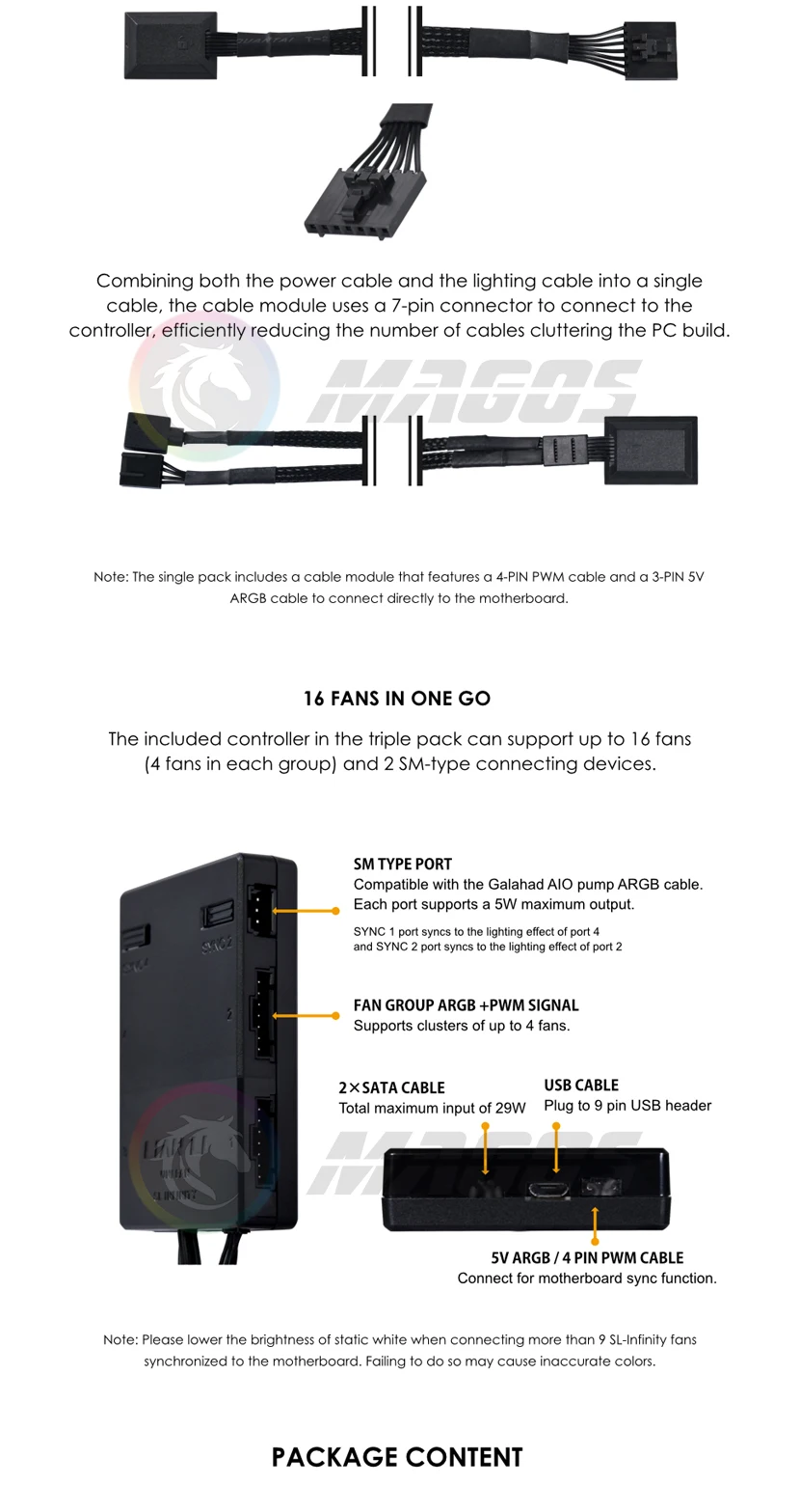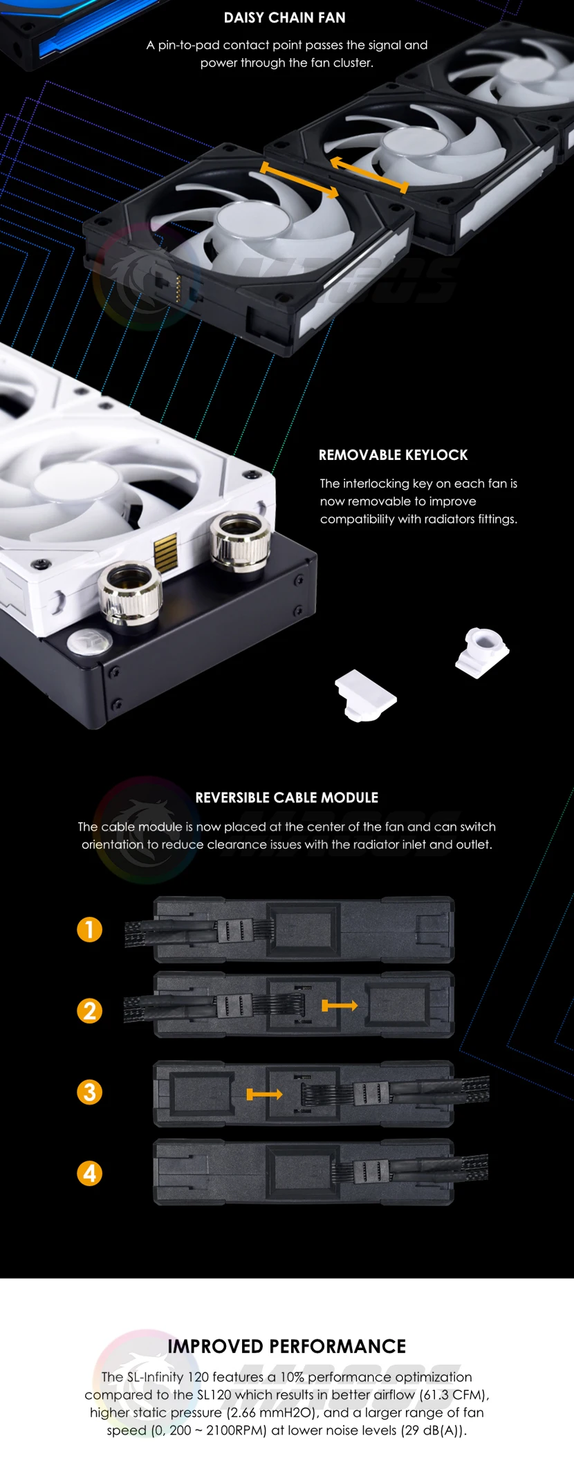 * ARGB DE MARCO LATERAL: siguiendo el icónico estilo de iluminación angular de los ventiladores SL, los ventiladores SL-Infinity tienen 2 tiras LED delgadas en ambos lados de las aspas del ventilador.