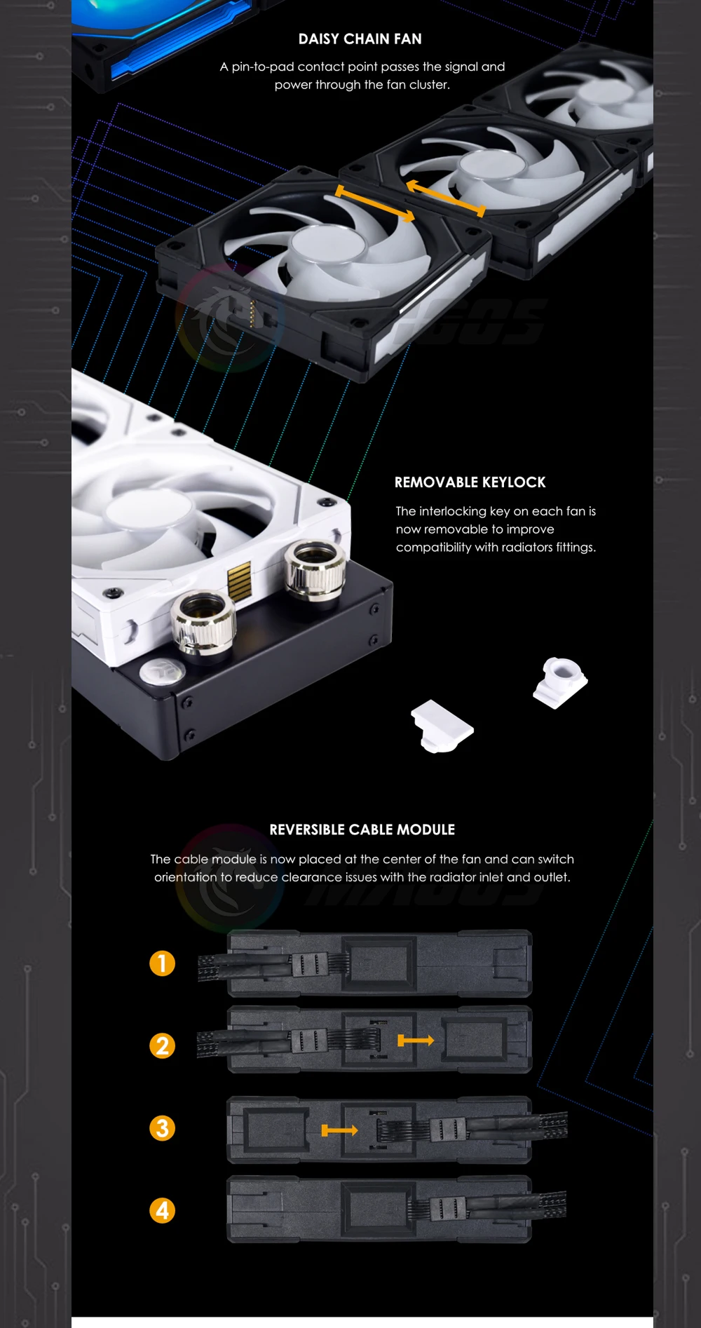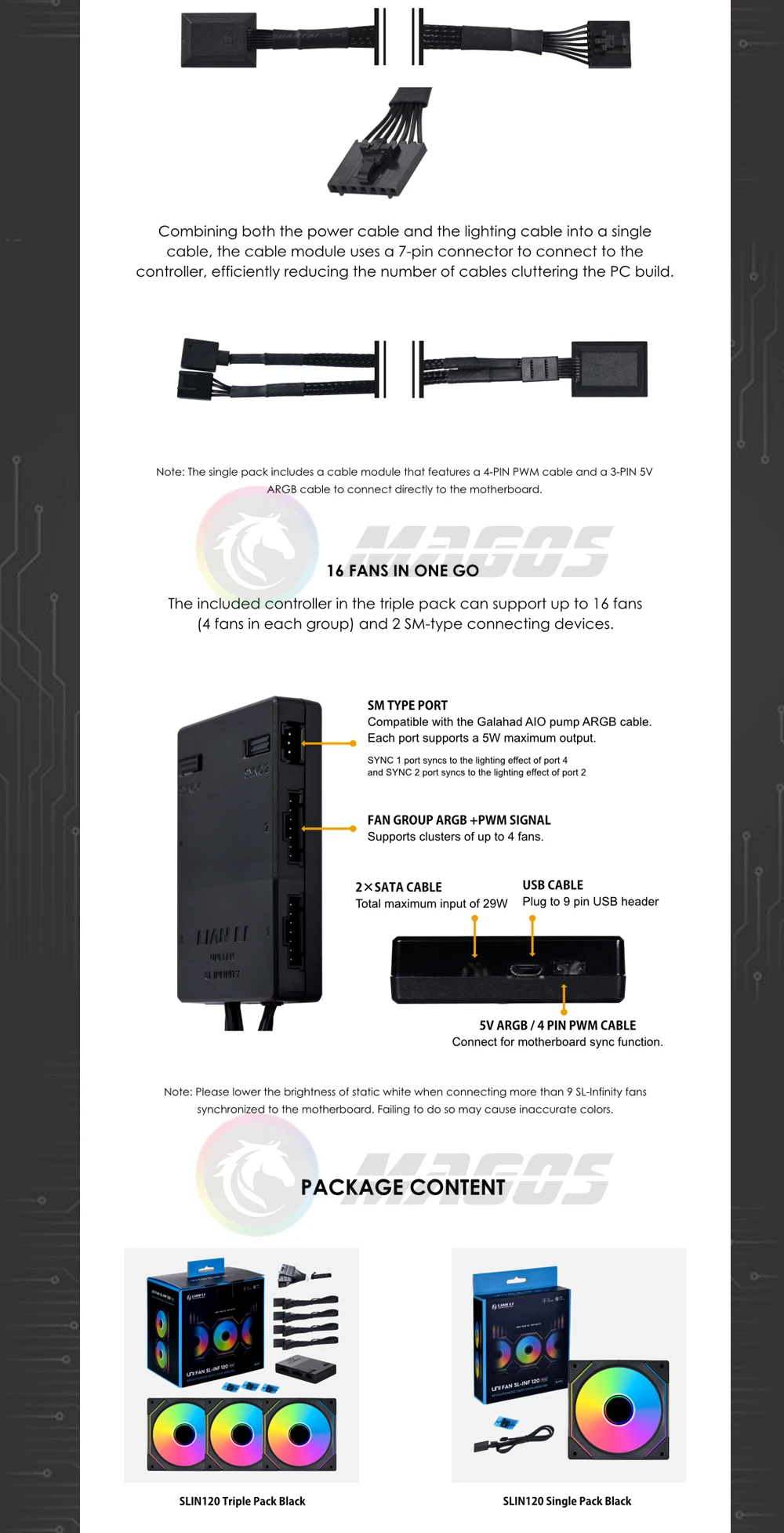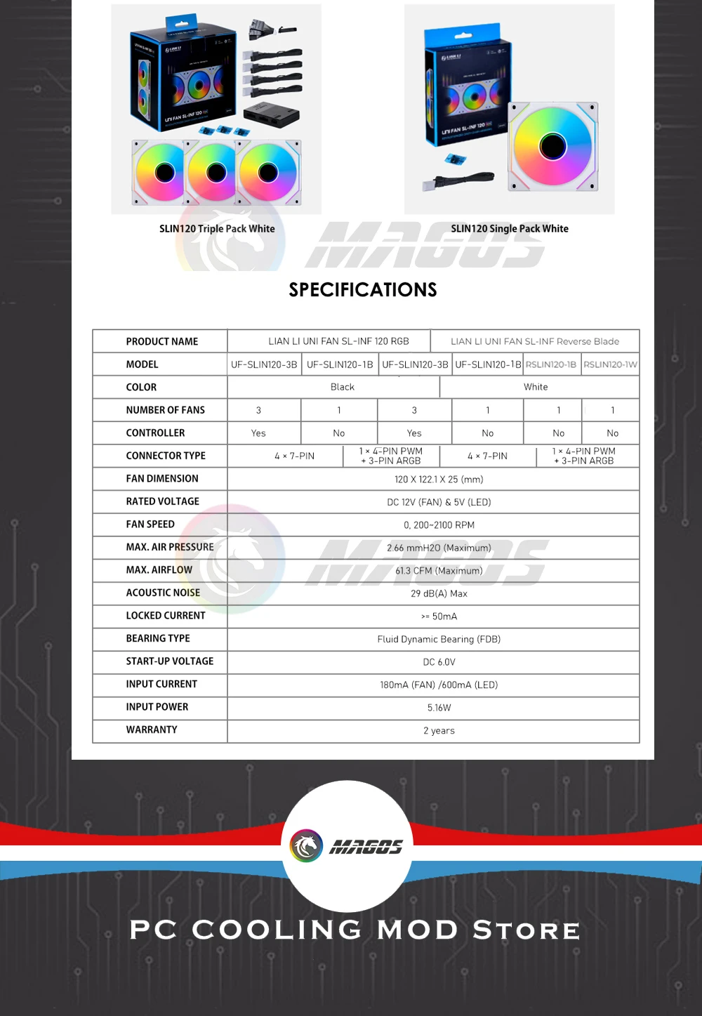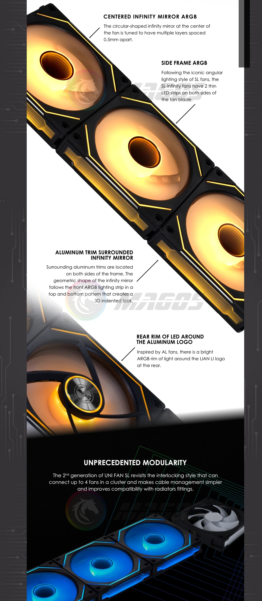 * MARCO LATERAL ARGB: siguiendo el icónico estilo de iluminación angular de los ventiladores SL, los ventiladores SL-Infinity tienen 2 tiras LED delgadas en ambos lados de la ASPA del ventilador.