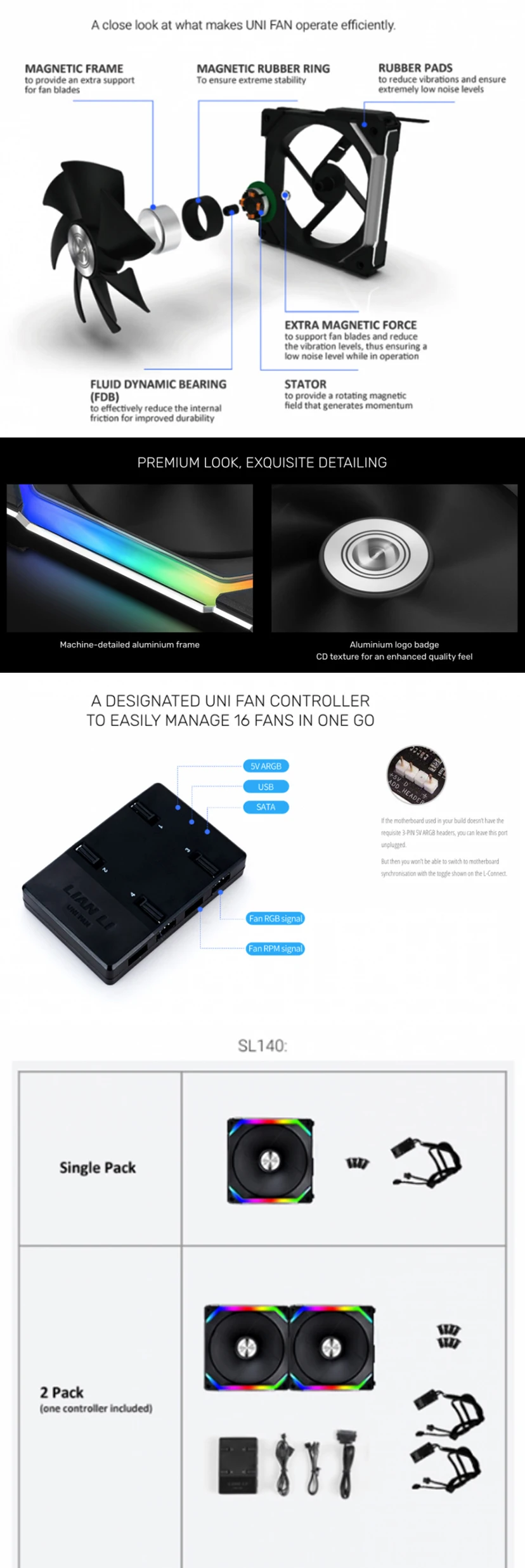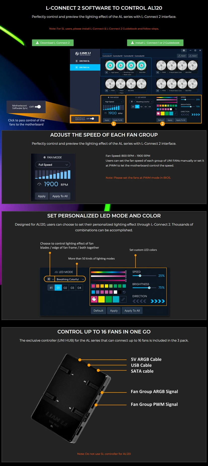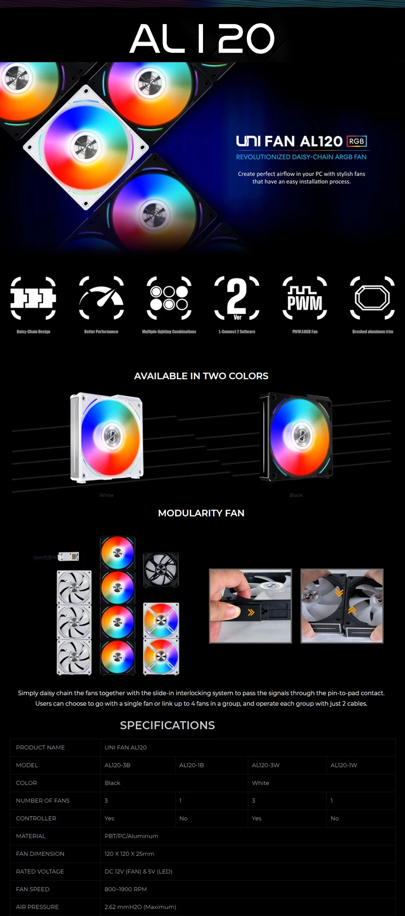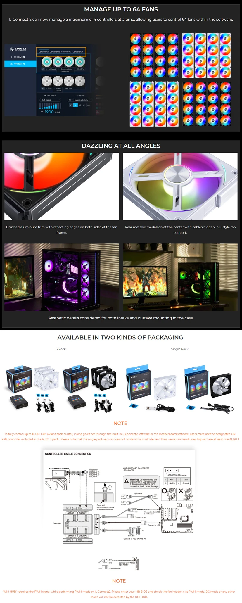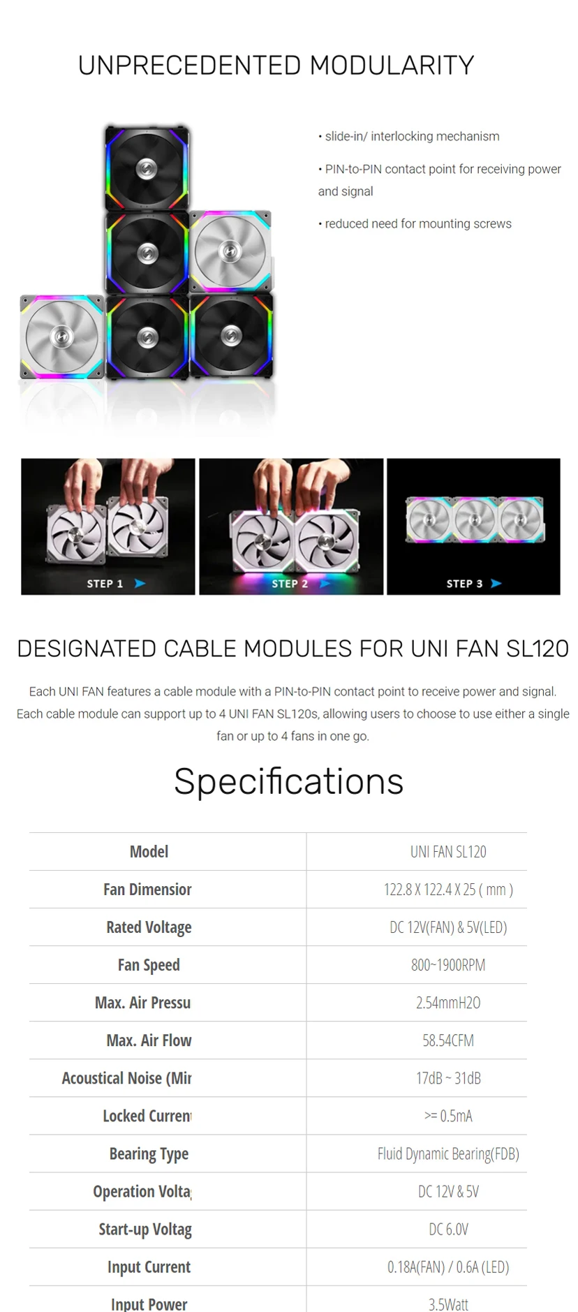 LIANLI UNI FAN SL 120 RGB MOD HUB Kit , 120mm Radiador Daisy Chain Ventilador sin cable, Software Smart PWM Control A-RGB