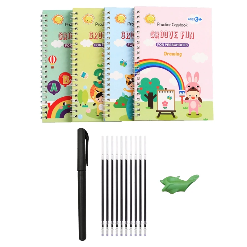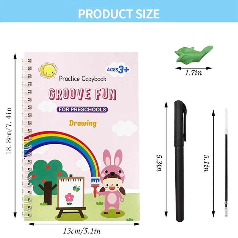 [Grooved Handwriting Book Practice]:The grooved handwriting book size is 5.1 inches x 7.4 inches,includes 4 copybooks+1 pen holder+10 pen refills+1 handle.