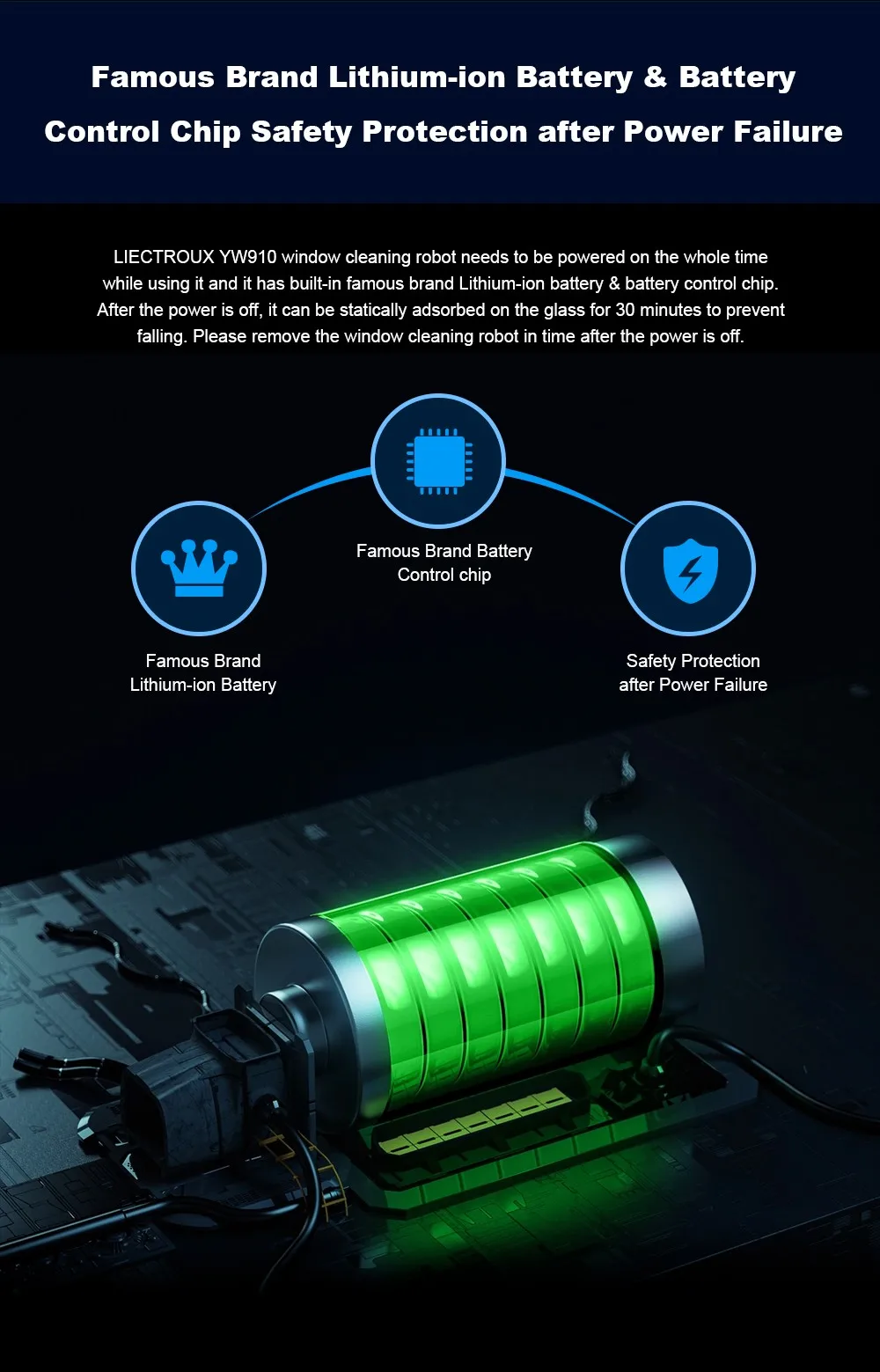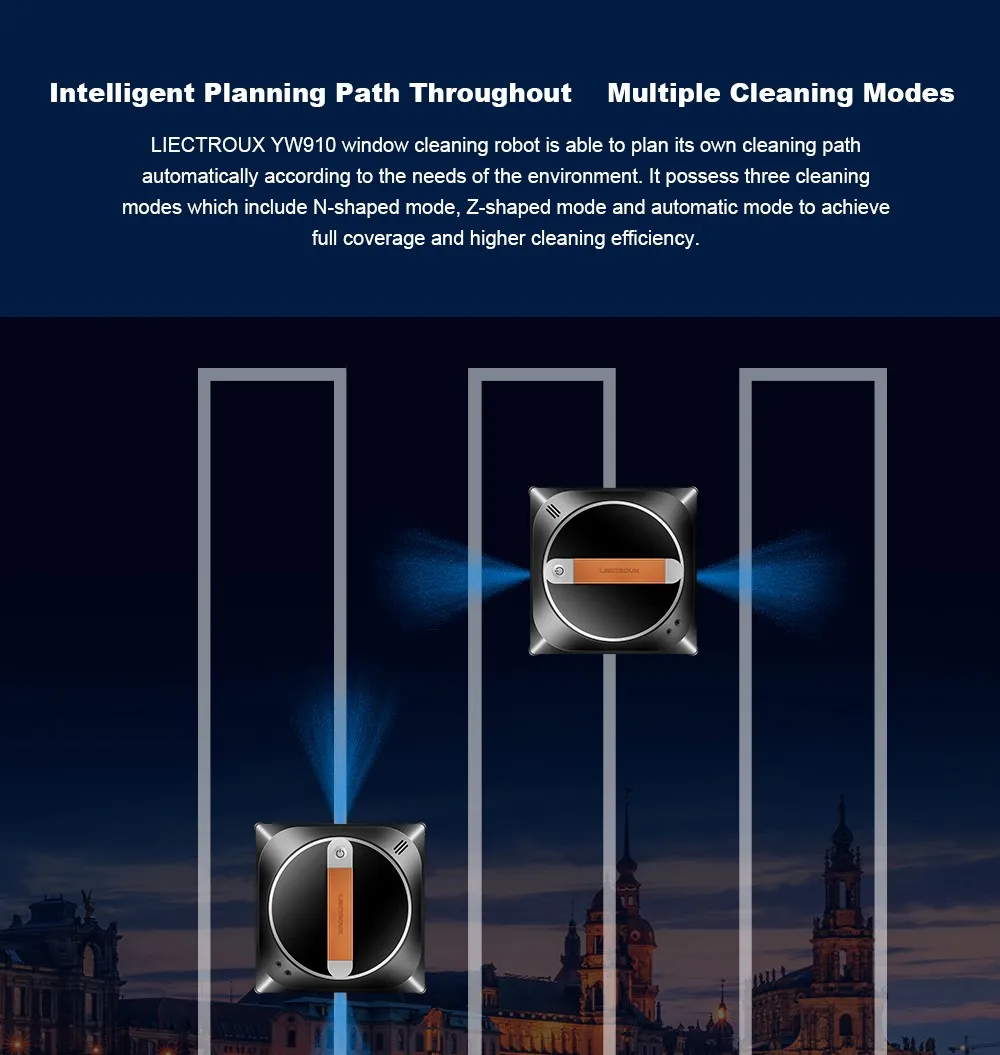 El robot limpiacristales LIECTROUX YW910 está diseñado para planificar su propio camino de limpieza automáticamente según el entorno.Cuenta con tres modos de limpieza: en forma de N, en forma de Z y automático, para garantizar una cobertura total y una mayor eficiencia de limpieza.Ya sea que necesite una limpieza profunda o un retoque rápido, el YW910 lo tiene cubierto.