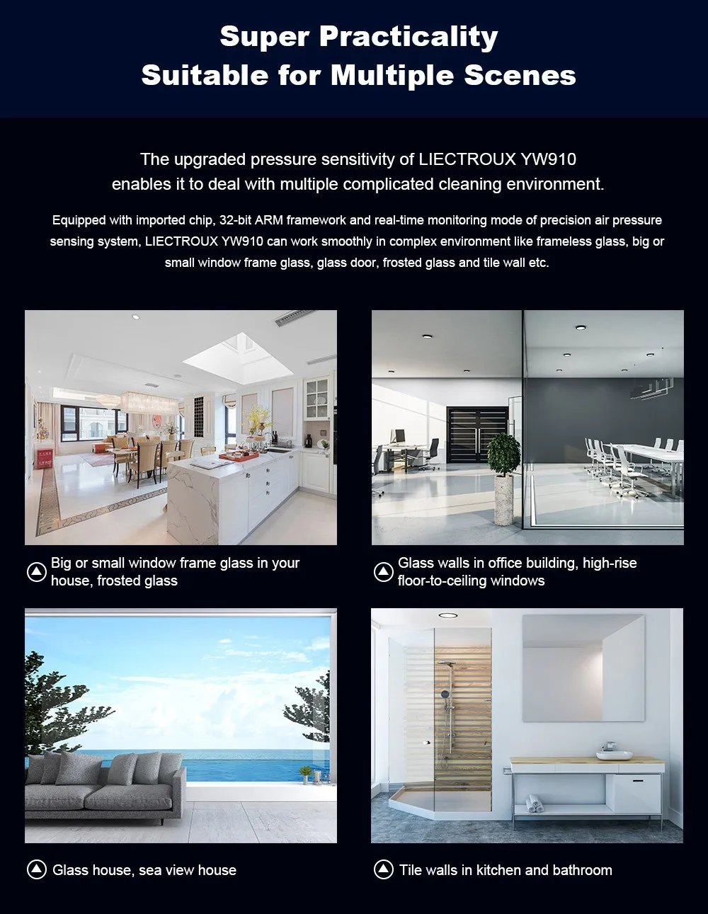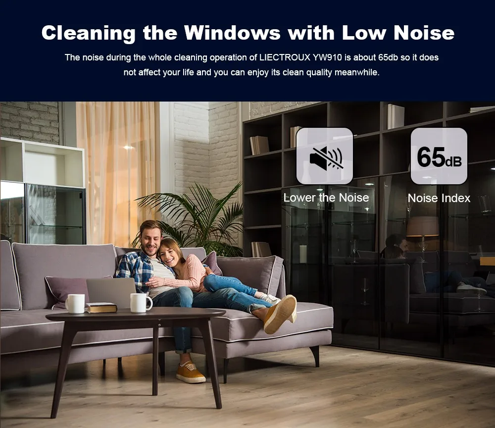 El LIECTROUX YW910 funciona a un nivel de ruido de aproximadamente 65 dB, lo que es lo suficientemente silencioso como para no perturbar sus actividades diarias.Disfrute de una ventana limpia y brillante sin la interrupción de los ruidos fuertes.