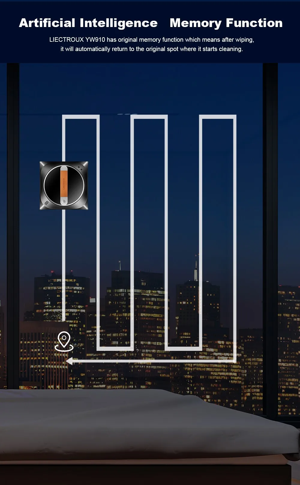 Después de completar su tarea de limpieza, el LIECTROUX YW910 regresa automáticamente al lugar original donde comenzó.Esta característica garantiza que sus ventanas se mantengan limpias y que el robot esté siempre listo para su próxima sesión de limpieza.
