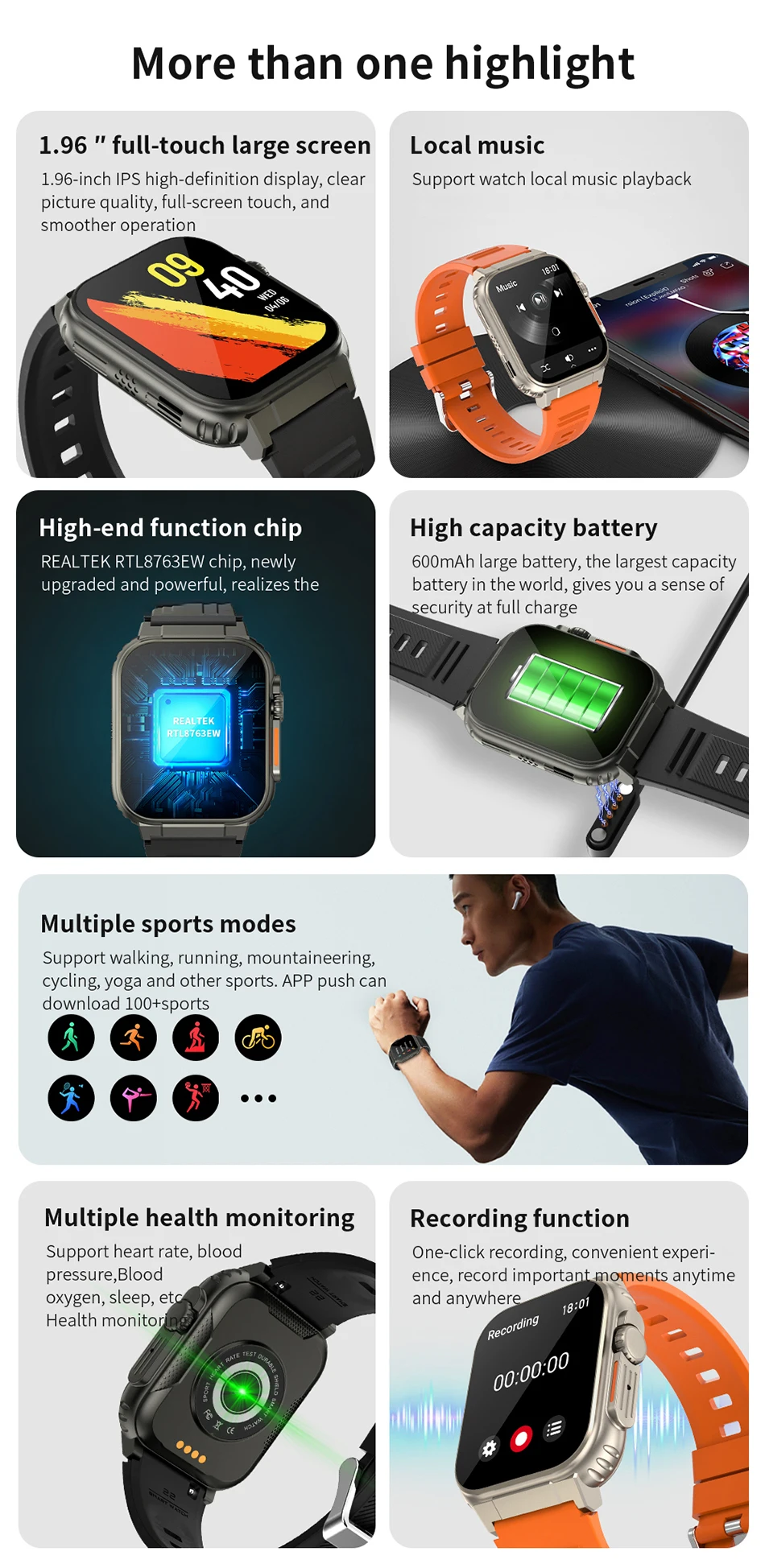 • Gran capacidad de la batería :Con una capacidad de batería de más de 600mAh, este reloj inteligente puede durar días con una sola carga, lo que lo hace perfecto para actividades al aire libre.