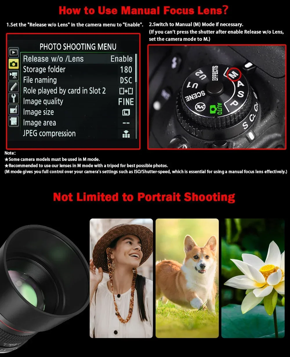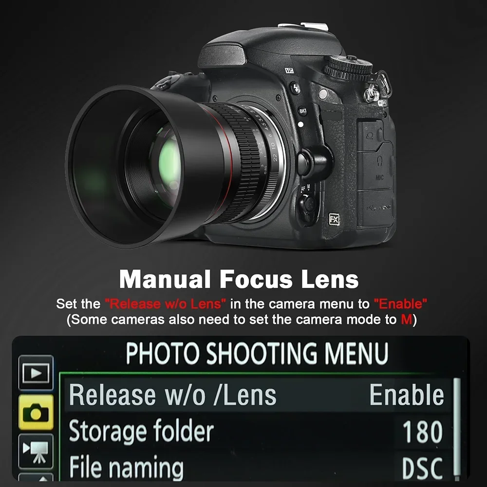 Consejos cálidos: Esta es una LENTE DE ENFOQUE MANUAL, SIN contactos electrónicos, su cámara no detectará la lente cuando esté montada, por eso muestra "SIN LENTE AJUSTADA", cambie al MODO MF para usar esta lente correctamente.Consejos para utilizar nuestra lente manual: 1) Configure el dial de modo en Manual (M).2) Configure la opción de liberación sin lente en el menú de la cámara para habilitarla.3) Configure la opción de bloqueo del obturador en el menú de la cámara en OFF: sin lente.