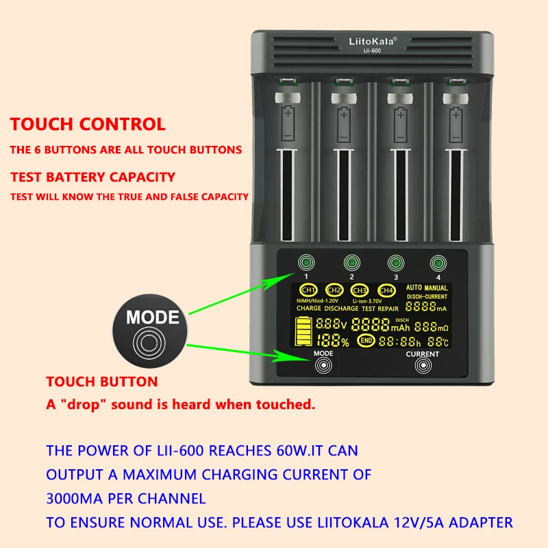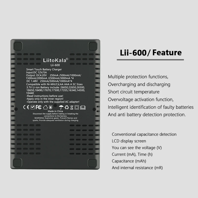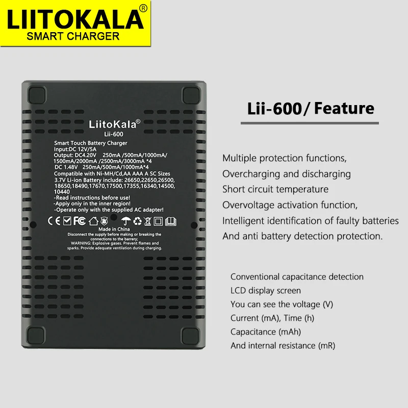 Comprar LiitoKala-cargador de batería de Lii-600, accesorio para baterías de iones de litio de 3,7 V y NiMH de 1,2 V, adecuado para 18650, 26650, 21700, 26700, AA, AAA, 12V, 5a