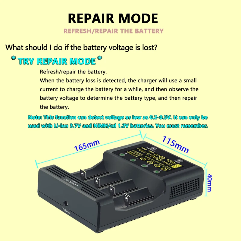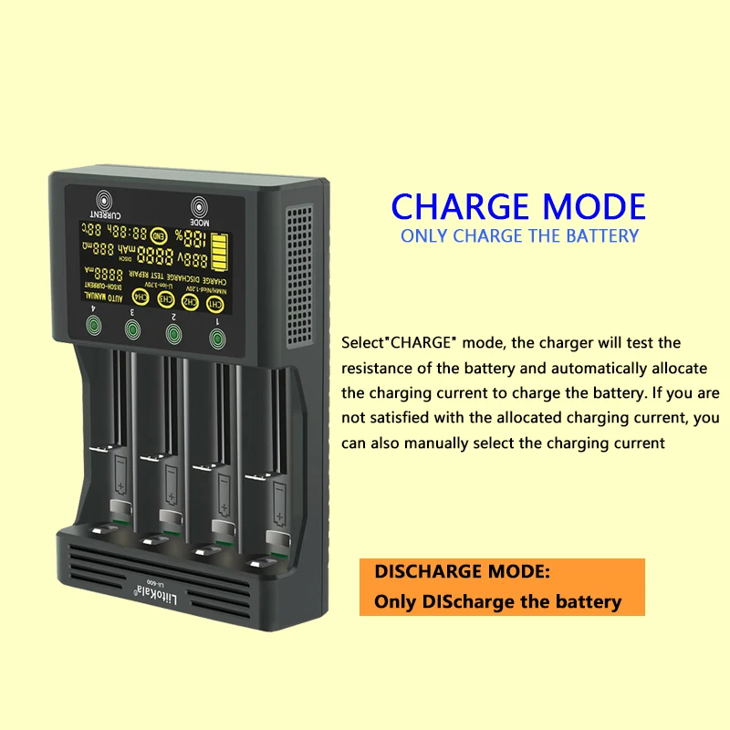 Con 4 tipos de ajuste de corriente de carga (250mA/500mA/1000mA/1500mA/2000m/3000mA), se puede utilizar para cargar diferentes tamaños (18650/26650/AA/AAA, etc.) de la batería simultáneamente.