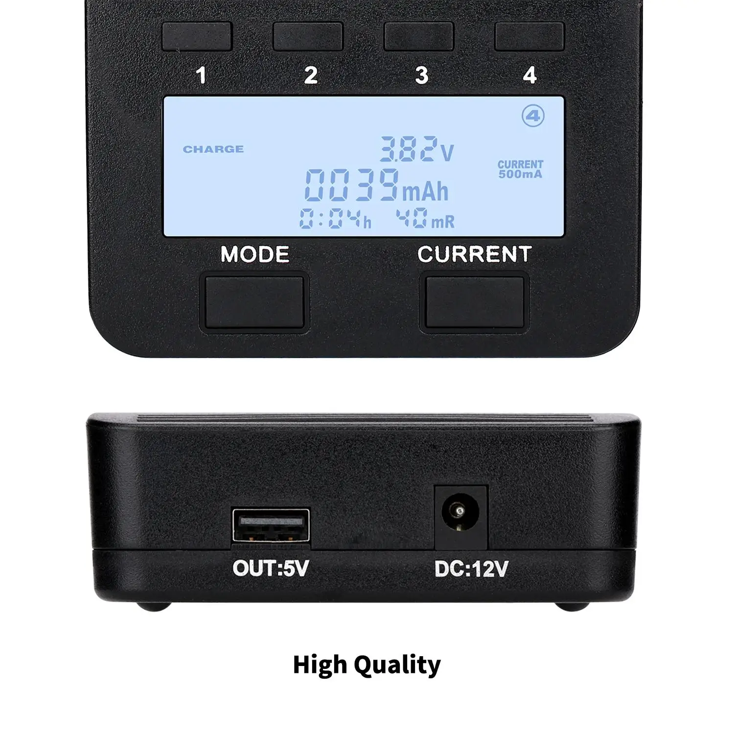 Con 4 tipos de ajuste de corriente de carga (300mA/500mA/700mA/1000mA), se puede utilizar para cargar diferentes tamaños (18650/26650/AA/AAA, etc.) de batería simultáneamente.