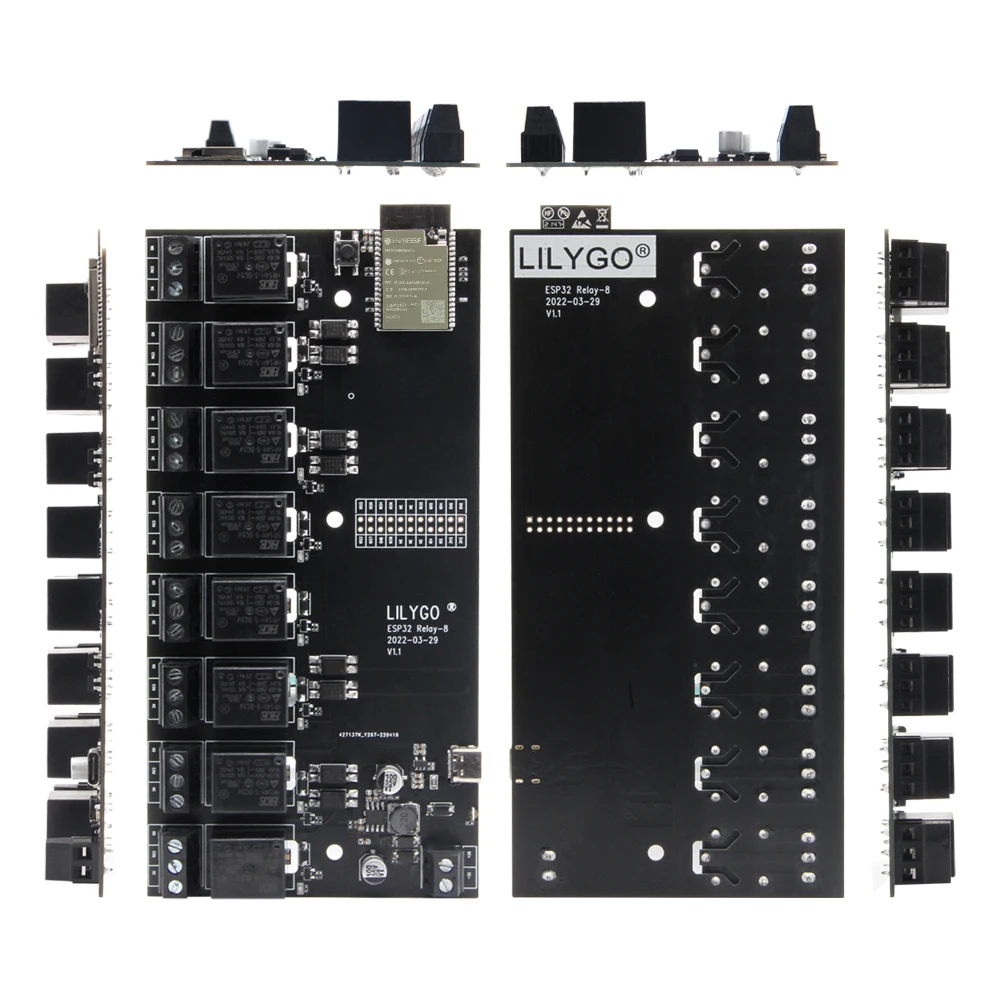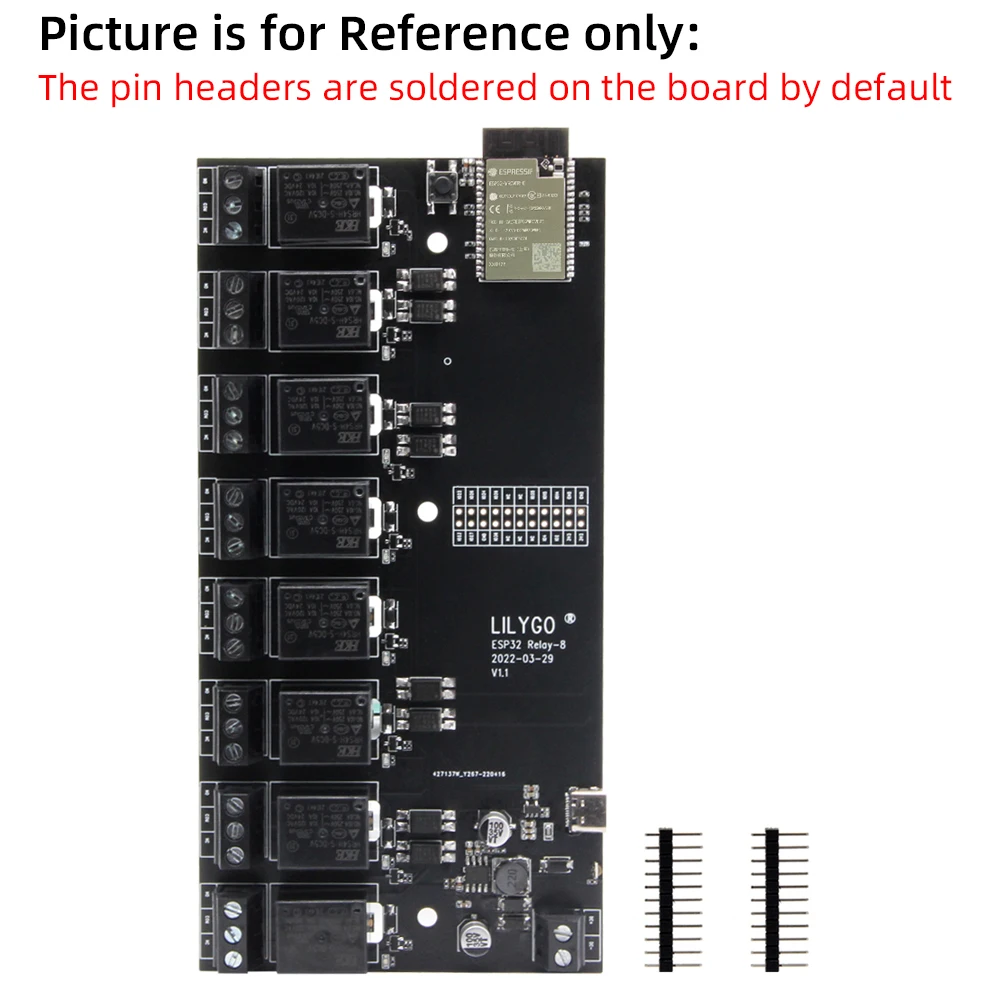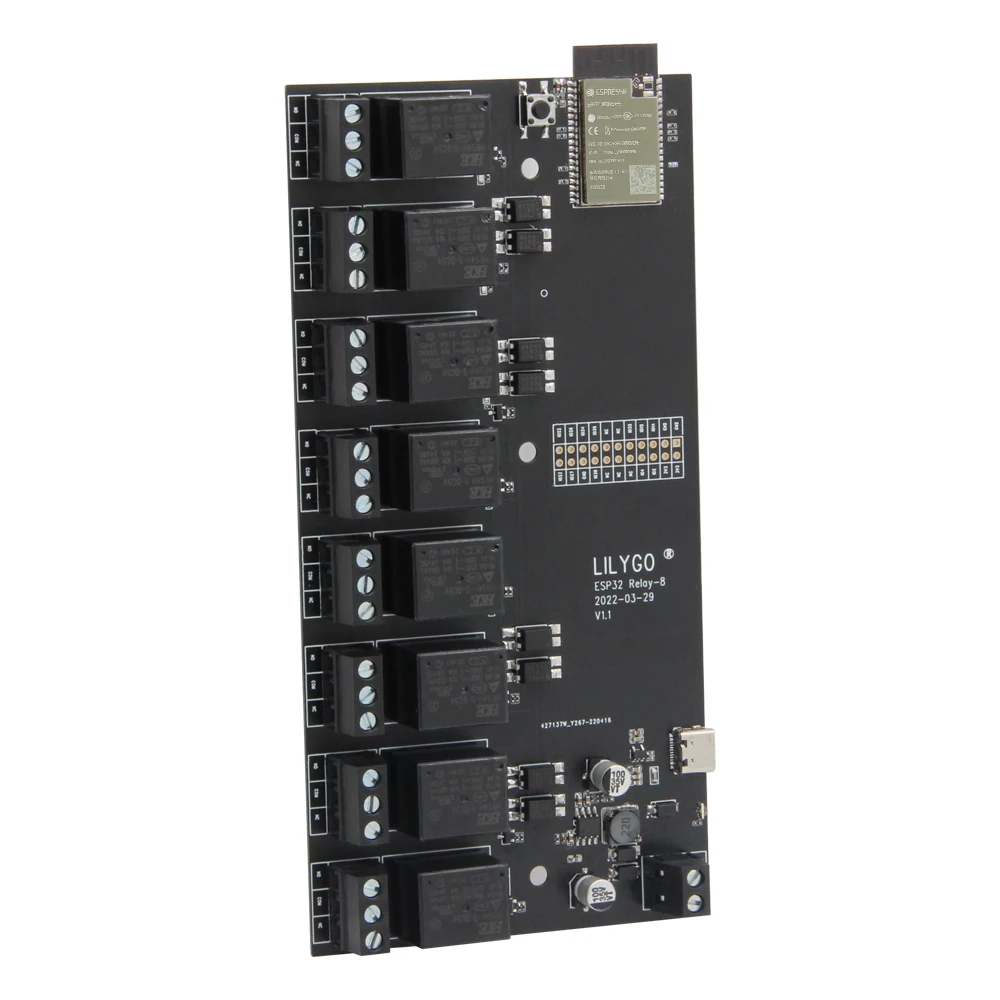 LILYGO® El relé T está equipado con un relé de 8 canales (con soporte de optoacoplador) y ESP32 (compatible con WIFI Bluetooth), y cada relé está equipado con un indicador individual y un indicador personalizado rojo.