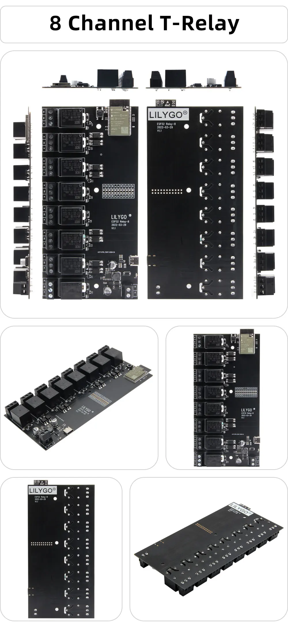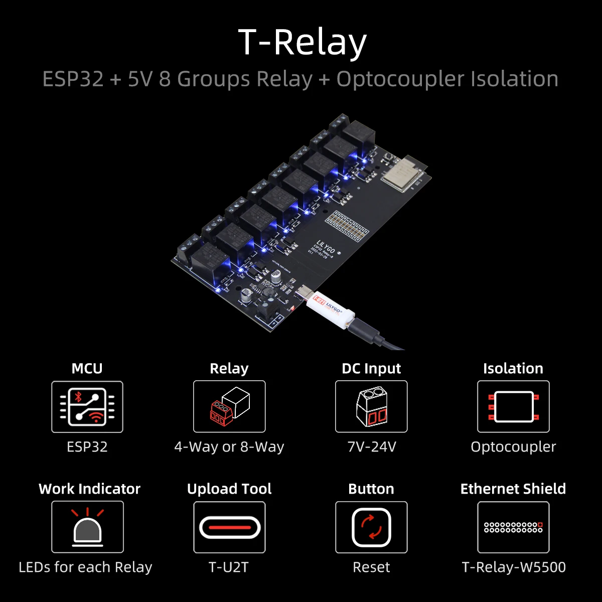 LILYGO ® Módulo de relé t-relé ESP32 de 5V, 8 canales con aislamiento de optoacoplador, placa de desarrollo inalámbrica, WIFI, Bluetooth para Arduino