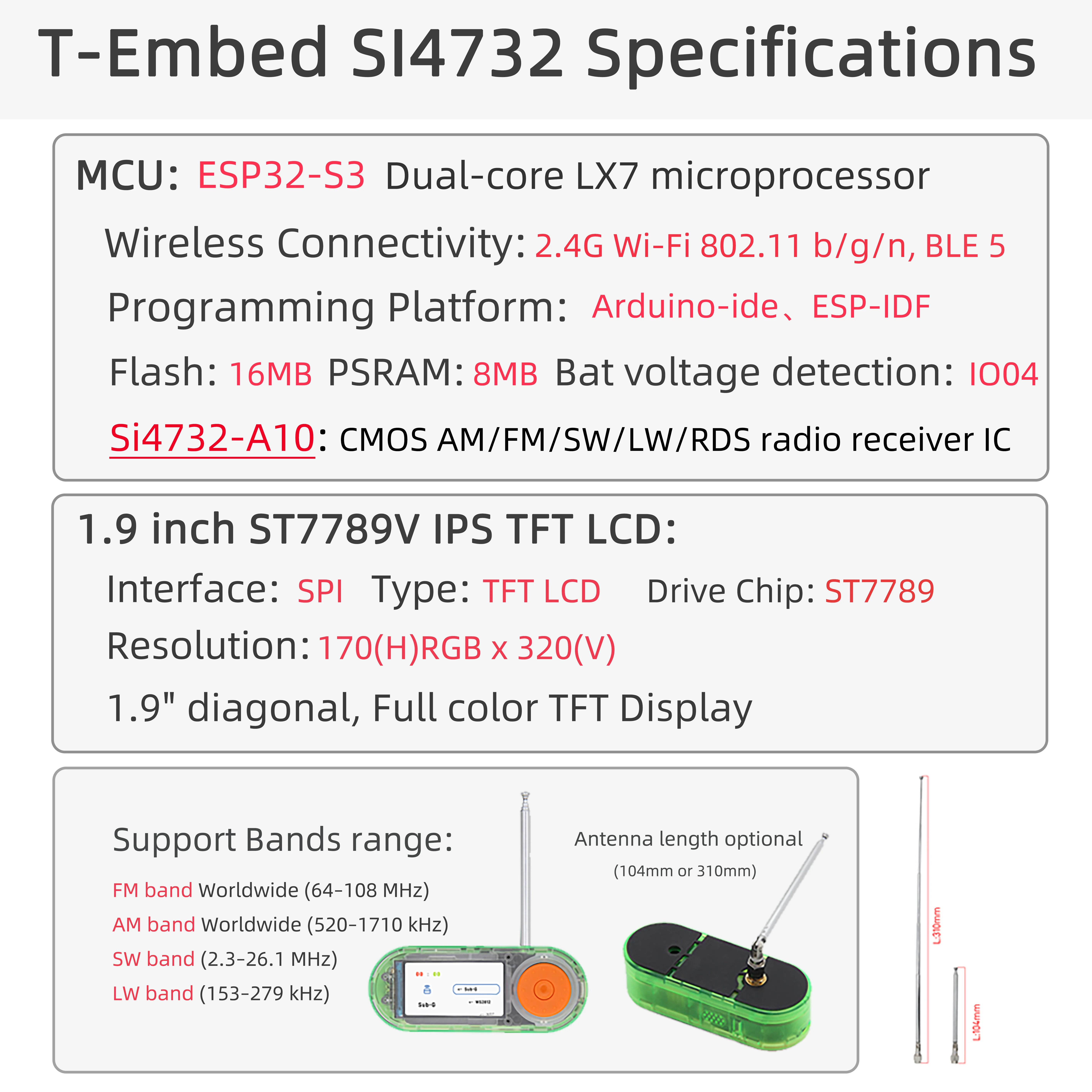 ElLILYGO® SI4732 integrado en Tes una versión mejorada de la serie T-Embed, que presenta elChip receptor de radio digital SI4732, diseñado para apoyarBandas de transmisión AM, FM, SW y LW.Este afinador de alto rendimiento ofrece una excelentesensibilidad de la señal, bajo consumo de energía y DSP (procesamiento de señal digital) integrado, lo que lo hace ideal para aplicaciones avanzadas de radio y audio.