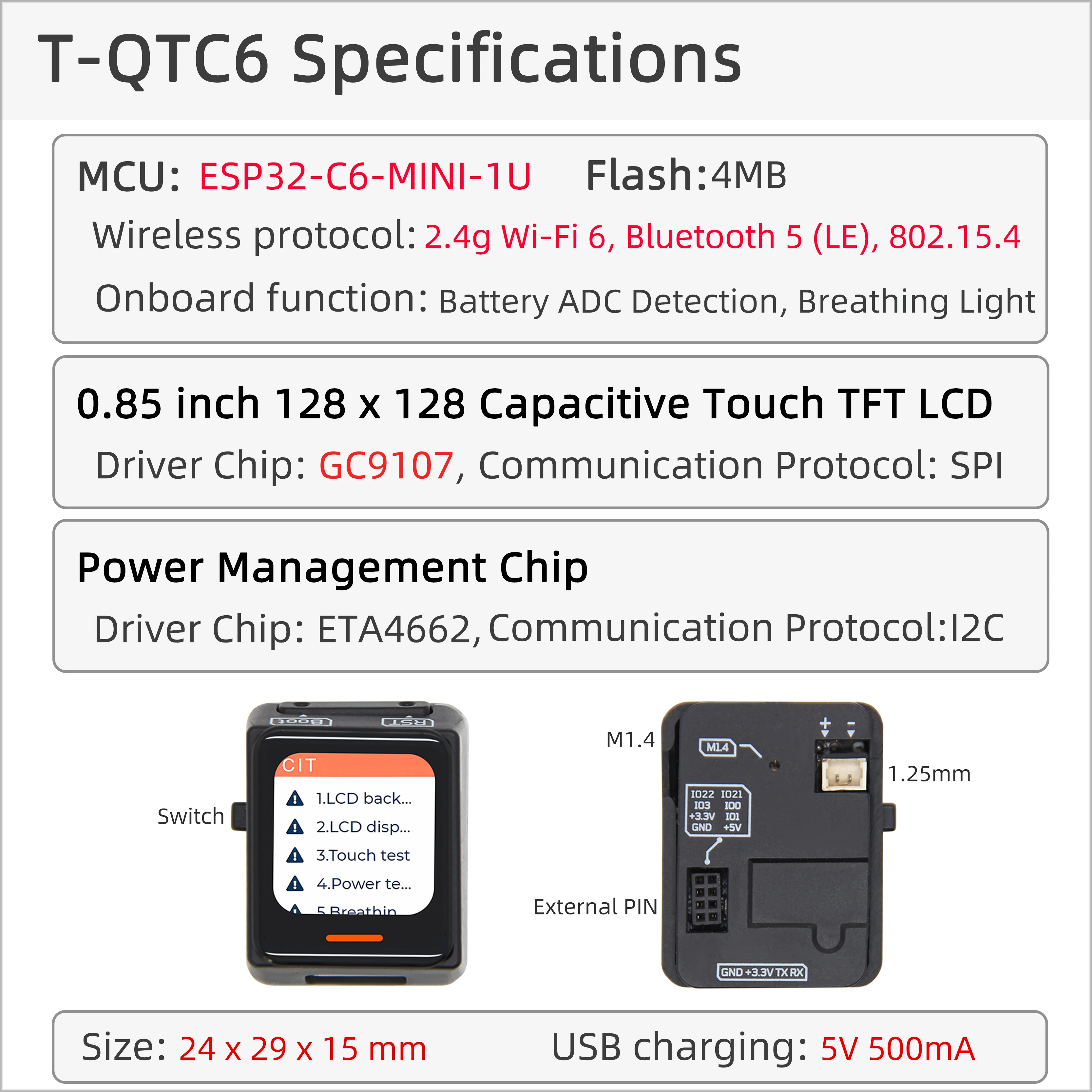 LILYGO® T-QTC6 Placa de desarrollo de , módulo inalámbrico con gestión de energía, pantalla LCD táctil de 0,85 pulgadas, WiFi 6, Bluetooth 5