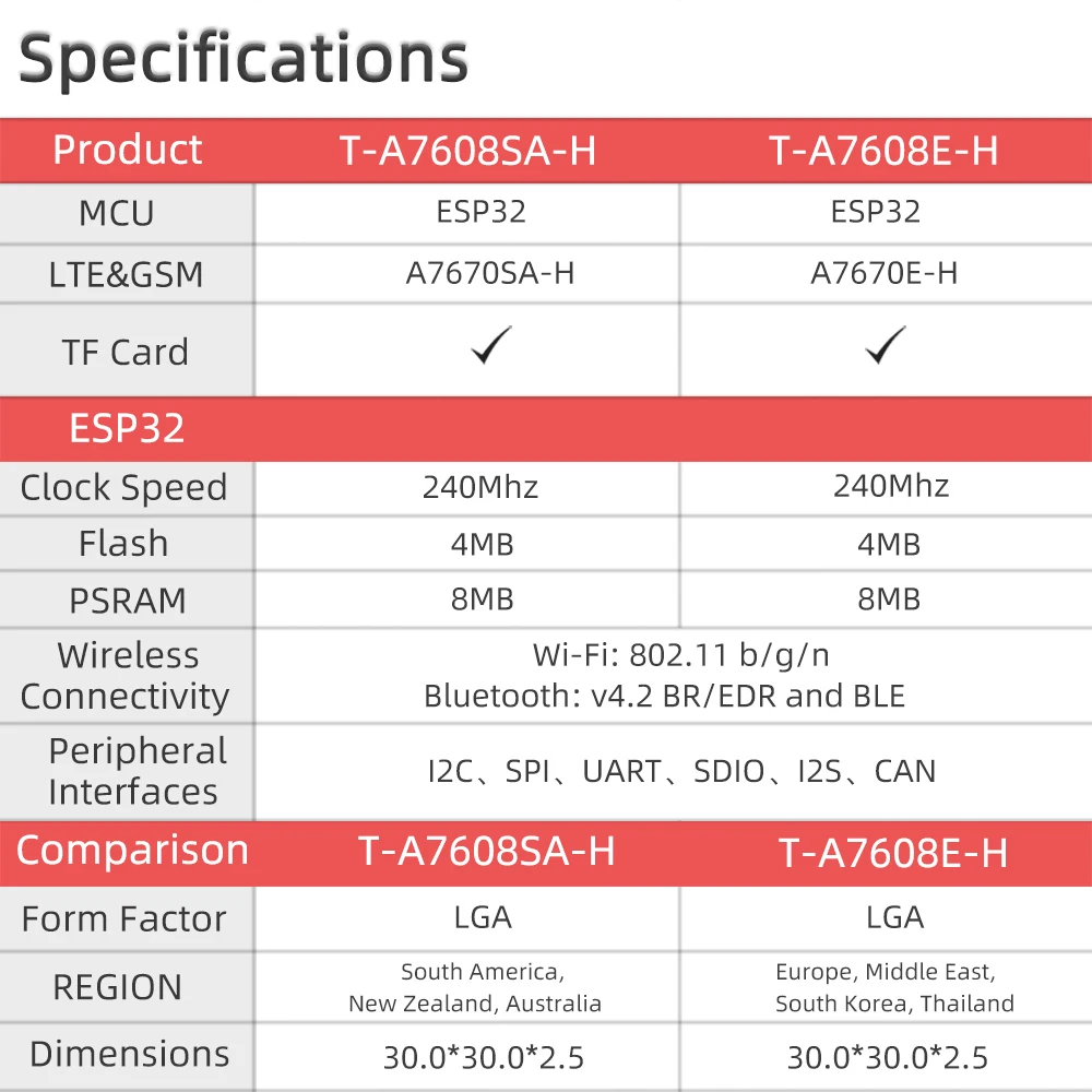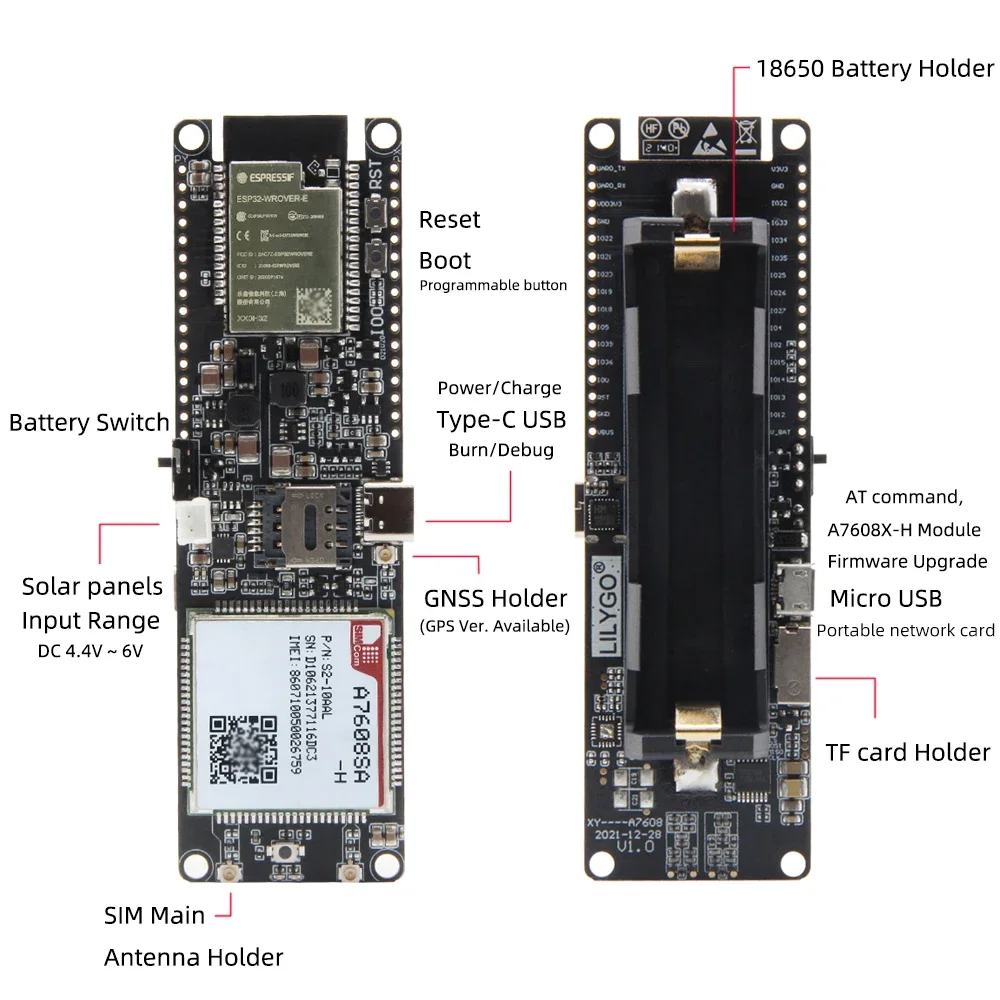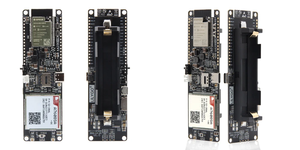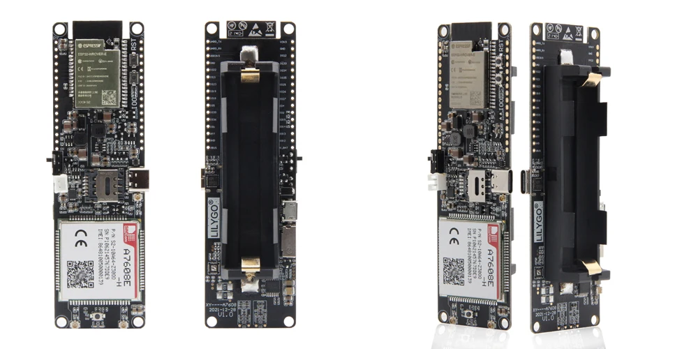 Tanto el como el T-A7608E-H están equipados conESP32Chip, que puede realizar funciones WIFI y Bluetooth, y están equipados con ranura para tarjeta SIM y ranura para tarjeta TF.