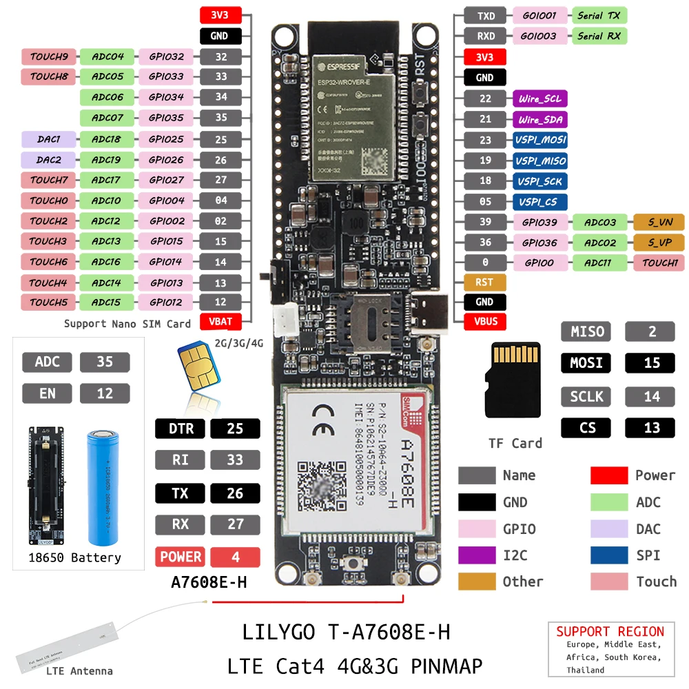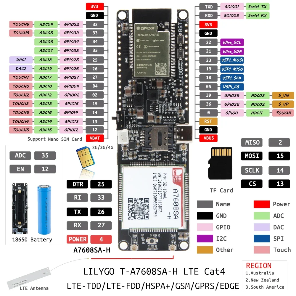 Comprar LILYGO®Placa de desarrollo T-SIM, A7608E-H, ESP32, LTE, Cat 4, alta velocidad, red 4G, GPS, WiFi, Bluetooth