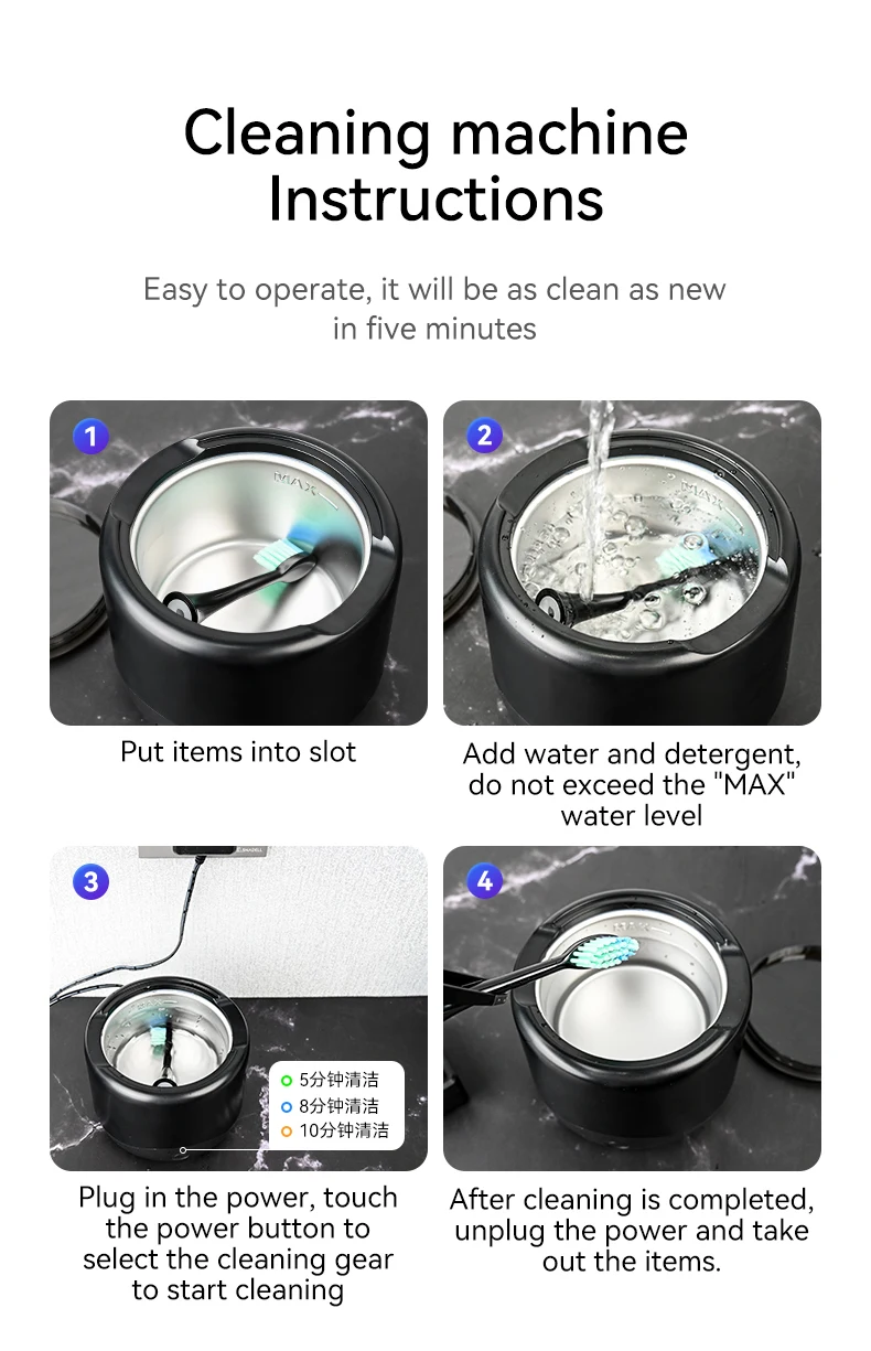 3.Fácil de usar: máquina de limpieza ultrasónica con control táctil clave, 5/8/10 minutos para que elijas limpiar, sin atención constante.Limpiador ultrasónico conectado al botón de encendido, muy sencillo y cómodo de usar, las personas mayores también se pueden utilizar fácilmente.