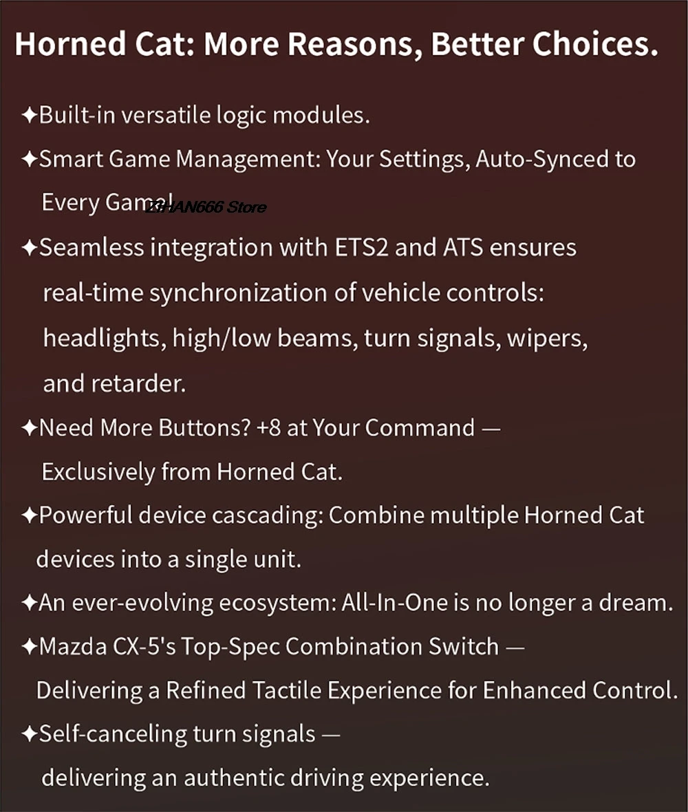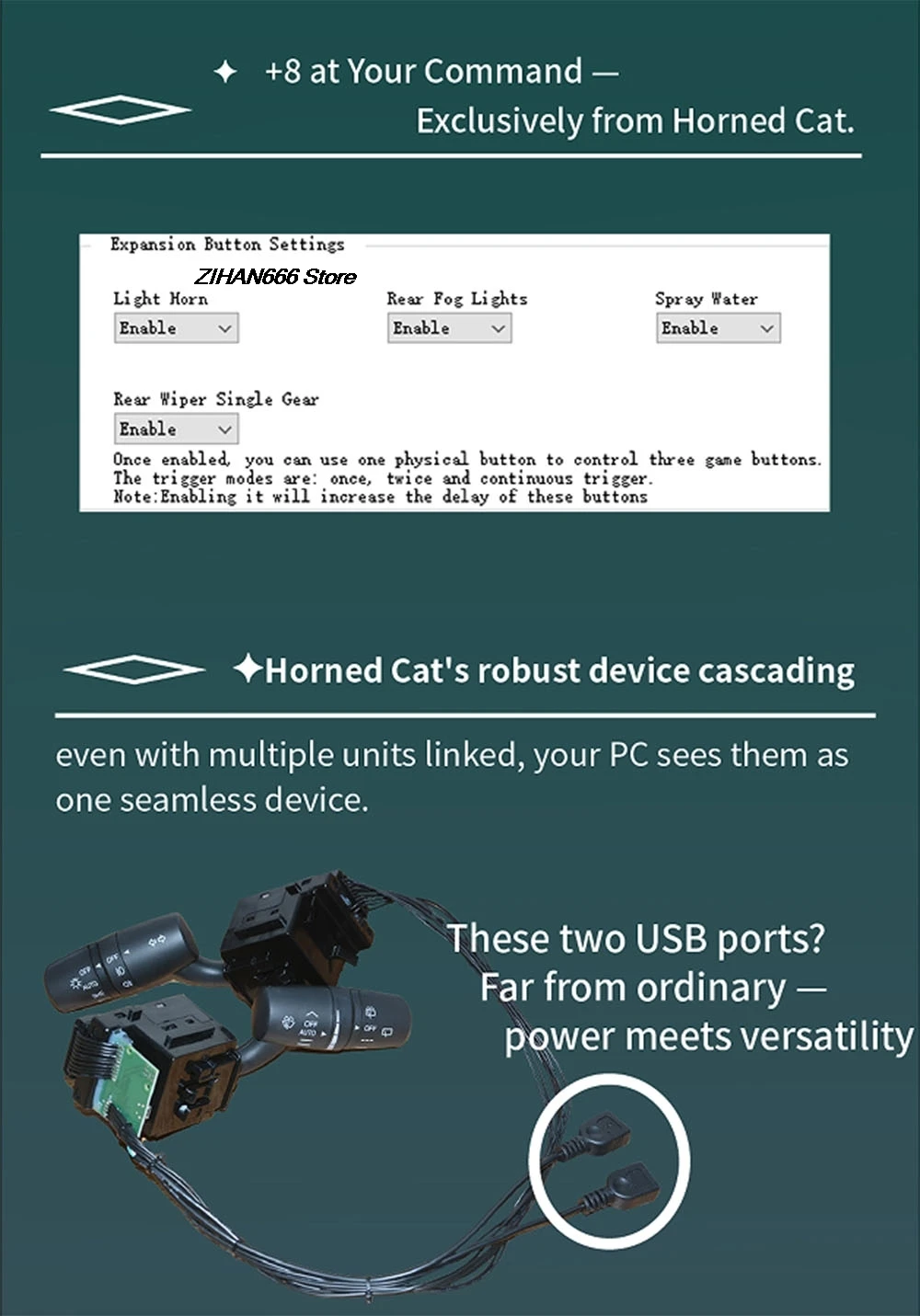 NOTA:Solo limpiaparabrisas, volante no incluido.* Construido con numerosas lógicas para que elijas*Potente gestión del juego, diferentes configuraciones de juego con diferente lógica, conmutación automática siguiendo el juego*EUKA 2 y Meika son perfectamente compatibles, con faros, luces altas y bajas, señales de giro, limpiaparabrisas y retardadores sincronizados en tiempo real para usted.*¿No hay suficientes botones?La función de extensión única le proporciona 8 botones adicionales para expansión.* Potente dispositivo en cascada que puede combinar varios dispositivos Horned Cat en un solo dispositivoUna computadora es sólo un dispositivo*Un ecosistema que mejora constantemente, AllIn One no es un sueño.*El interruptor superior de línea Mazda CX5 le proporciona una mejor experiencia operativa* Rebote automático, que le brinda una experiencia de conducción real