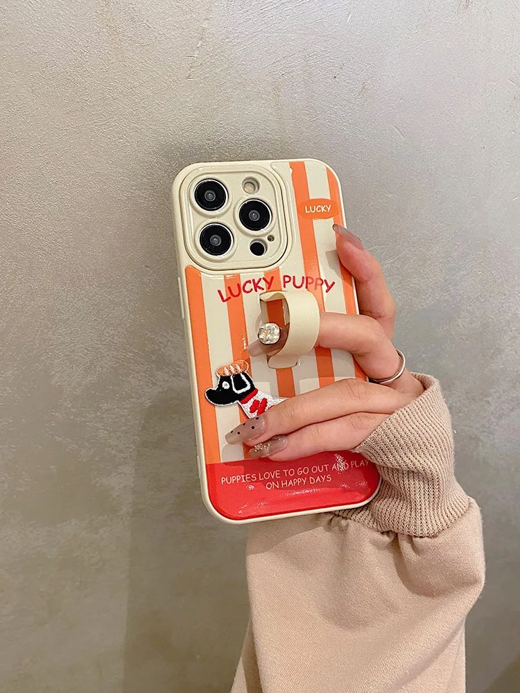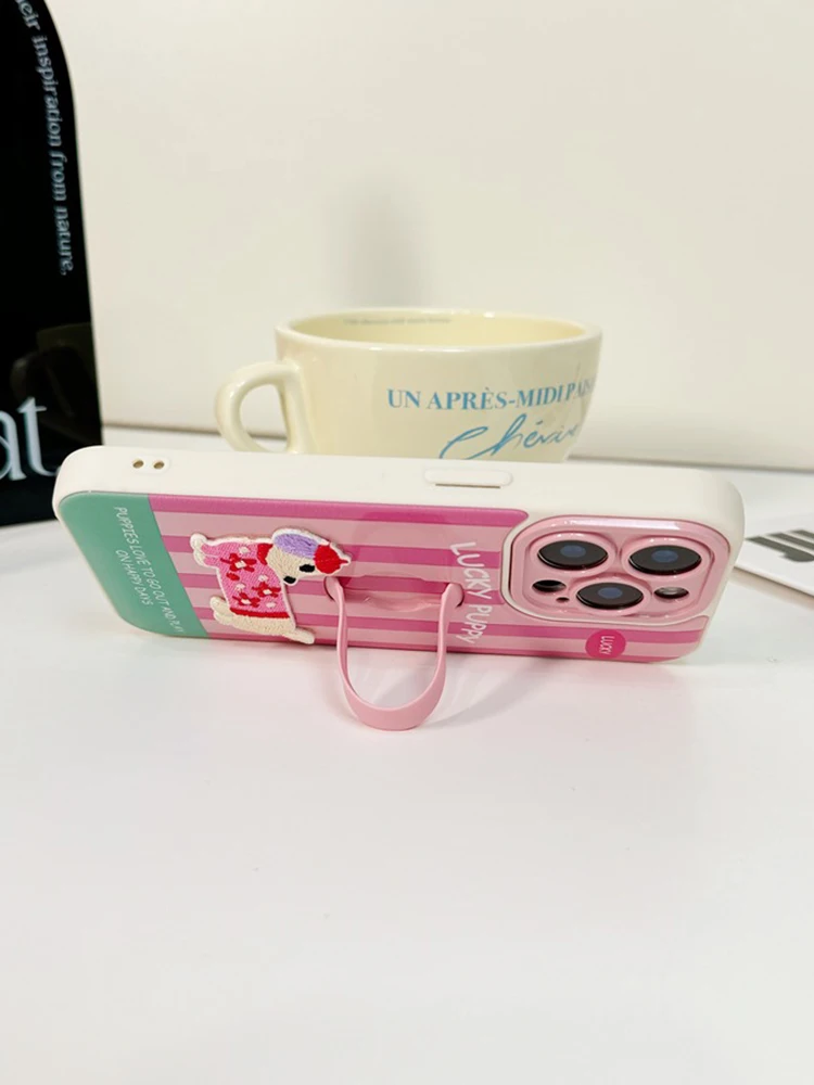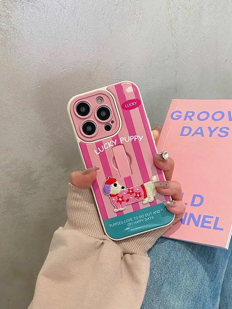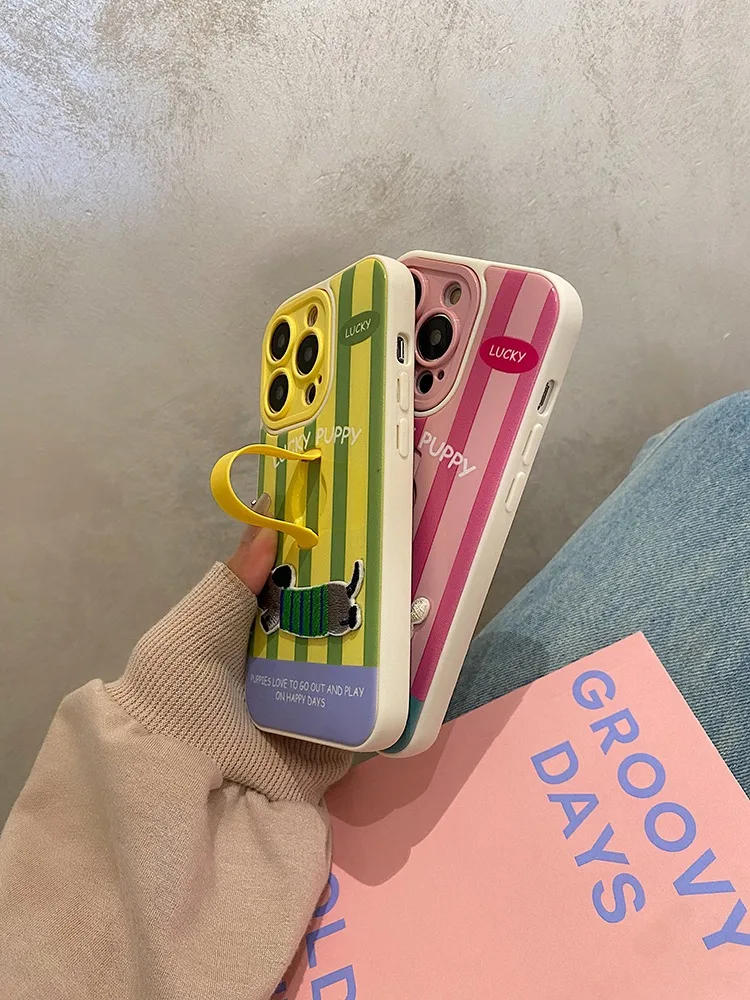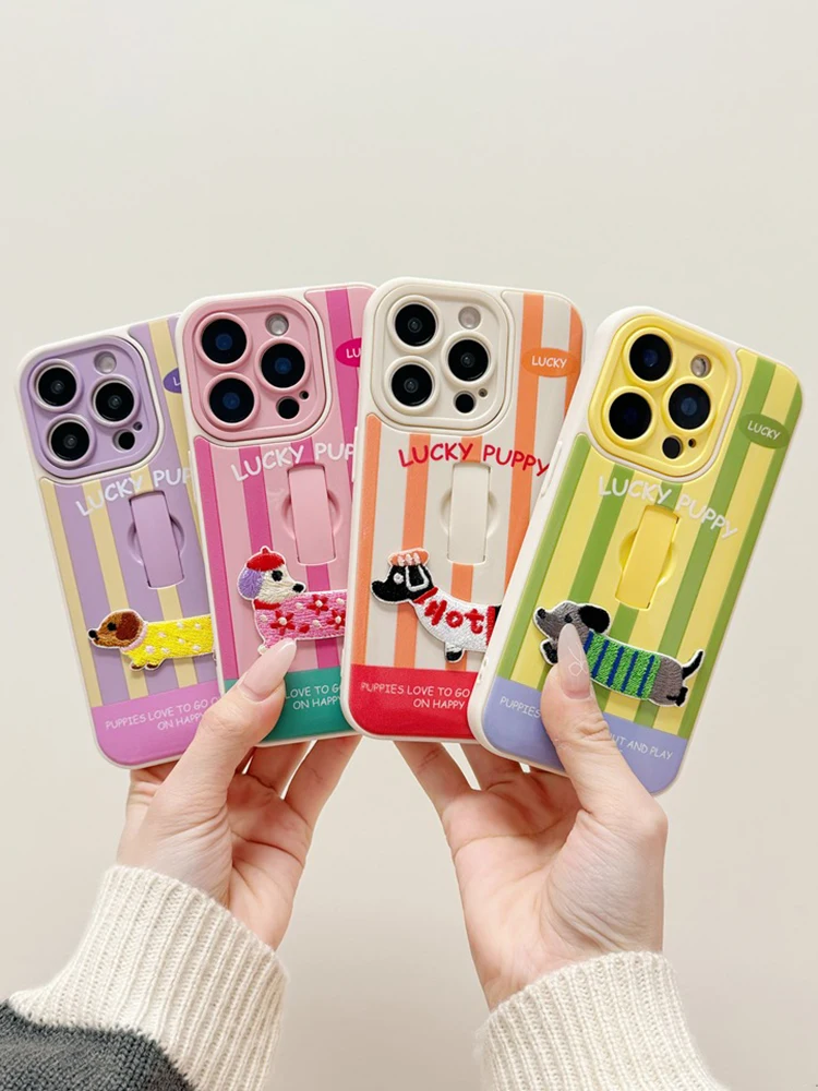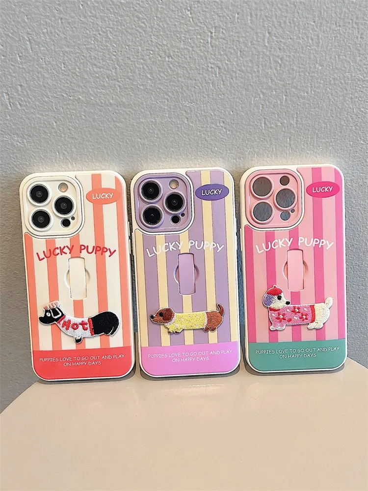 Funda con soporte de anillo para cachorro Dachshund con bordado bonito para iPhone 16 Pro Max 17 15 14 13 12 11, funda trasera a rayas coloridas