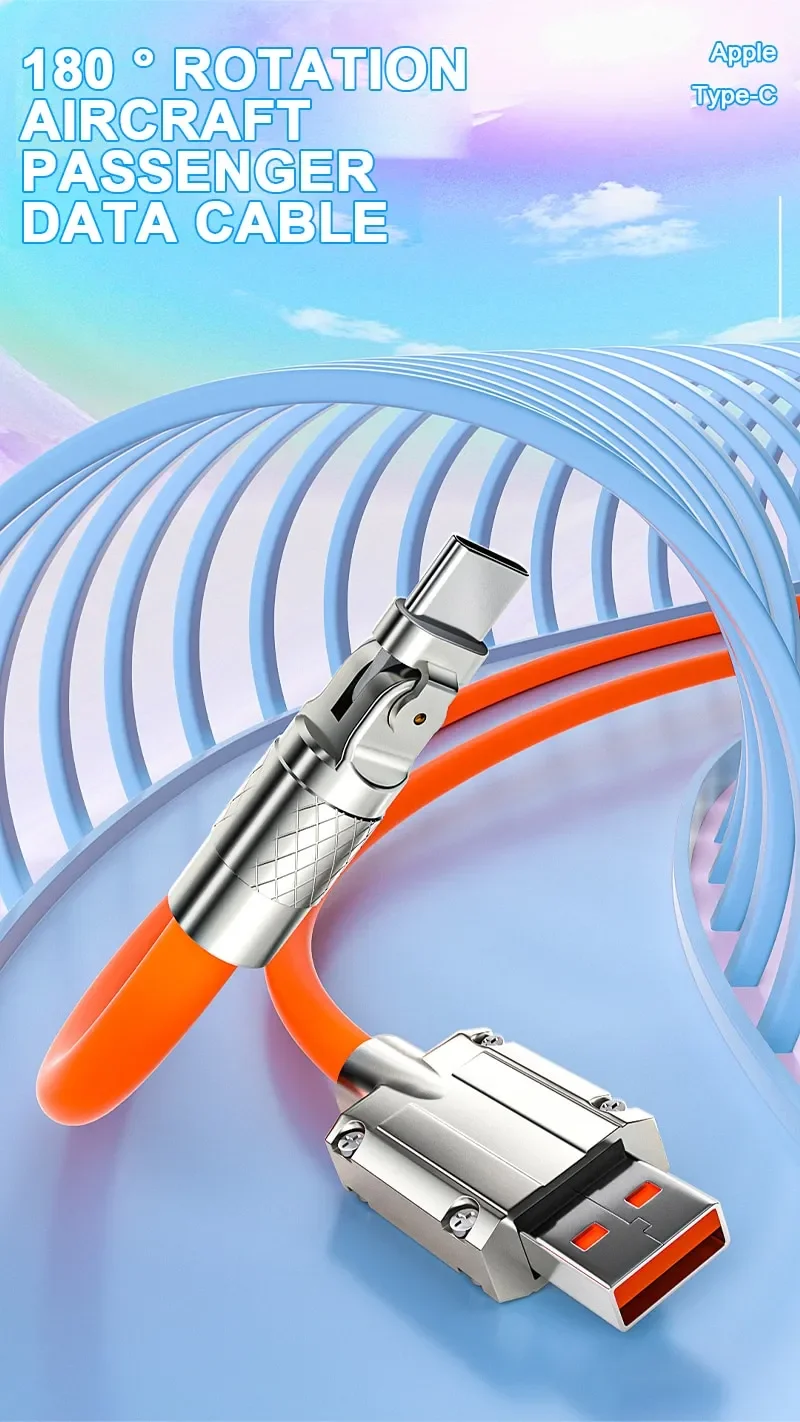 Línea de datos tipo C 120w carga rápida 6A 180 línea de carga ultrarrápida giratoria para Huawei Samsung Millet silicona alargada