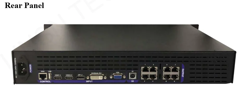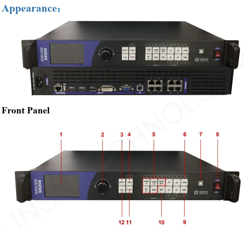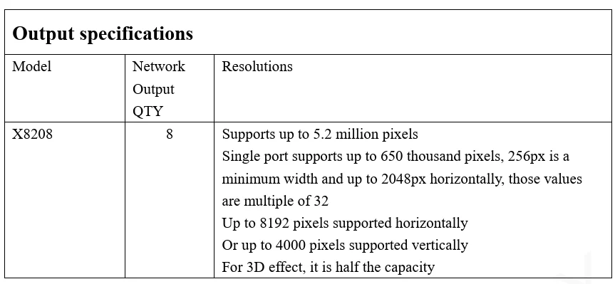 X8208, diseñado para pantallas LED grandes, que es un procesador de video profesional dos en uno. Admite entrada 4K, pantalla de 120Hz/3D, diseños de 3 ventanas y profundidad de color de 10 bits. Tiene 8 salidas y soporta hasta 5,2 millones de píxeles: hasta 8192 píxeles horizontalmente o 4000 píxeles verticalmente.