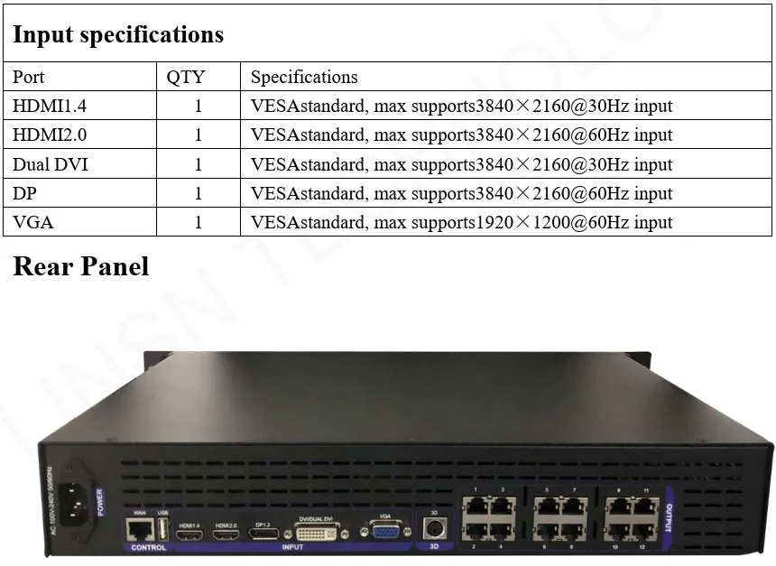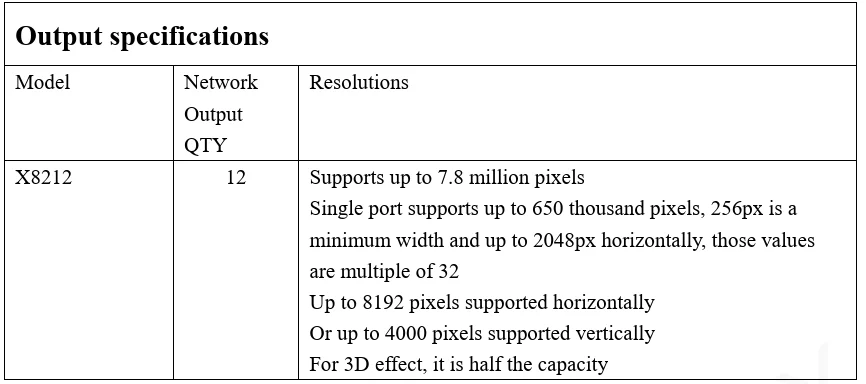 X8212, diseñado para pantalla LED grande, que es un procesador de video profesional dos en uno. Admite entrada 4K, pantalla de 120Hz/3D, diseños de 3 ventanas y profundidad de color de 10 bits. Tiene 12 salidas y admite hasta 7,8 millones de píxeles: hasta 8192 píxeles horizontalmente o 4000 píxeles verticalmente.