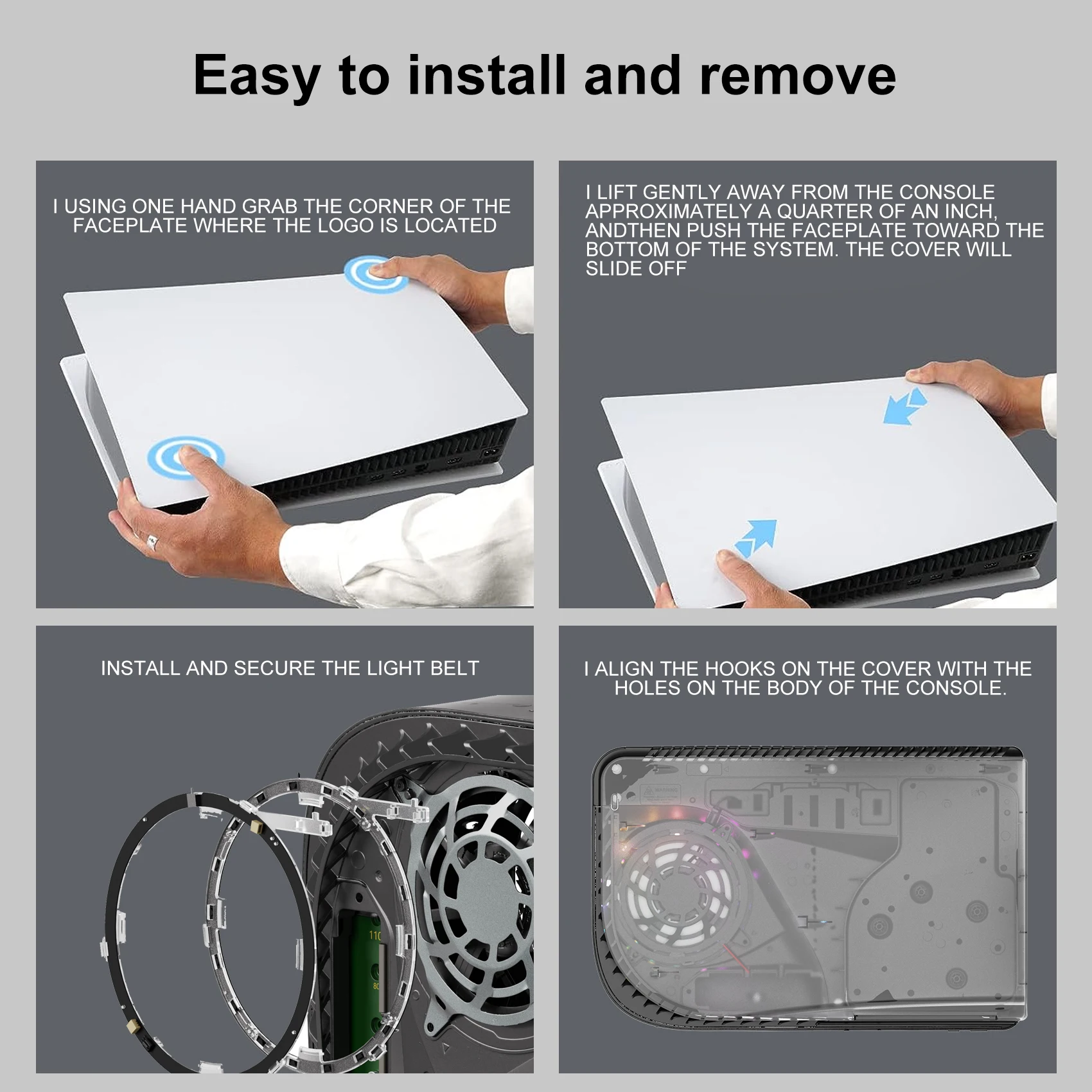 💫【Fácil de instalar y quitar】① Levante debajo de la esquina trasera de la cubierta protectora donde se encuentra el logotipo de PS5 y suelte la hebilla circular. ② Empuje la cubierta hacia la parte inferior de la consola y la cubierta se deslizará. ③ Pegue el autoadhesivo configurado en la parte posterior del anillo de luz LED y luego Fíjelo en la ventilación de la consola ps5. ④ Alinea LA NUEVA cubierta con el orificio de la unidad principal, empújala hasta la parte superior de la consola y luego la hebilla puede completar la fijación.
