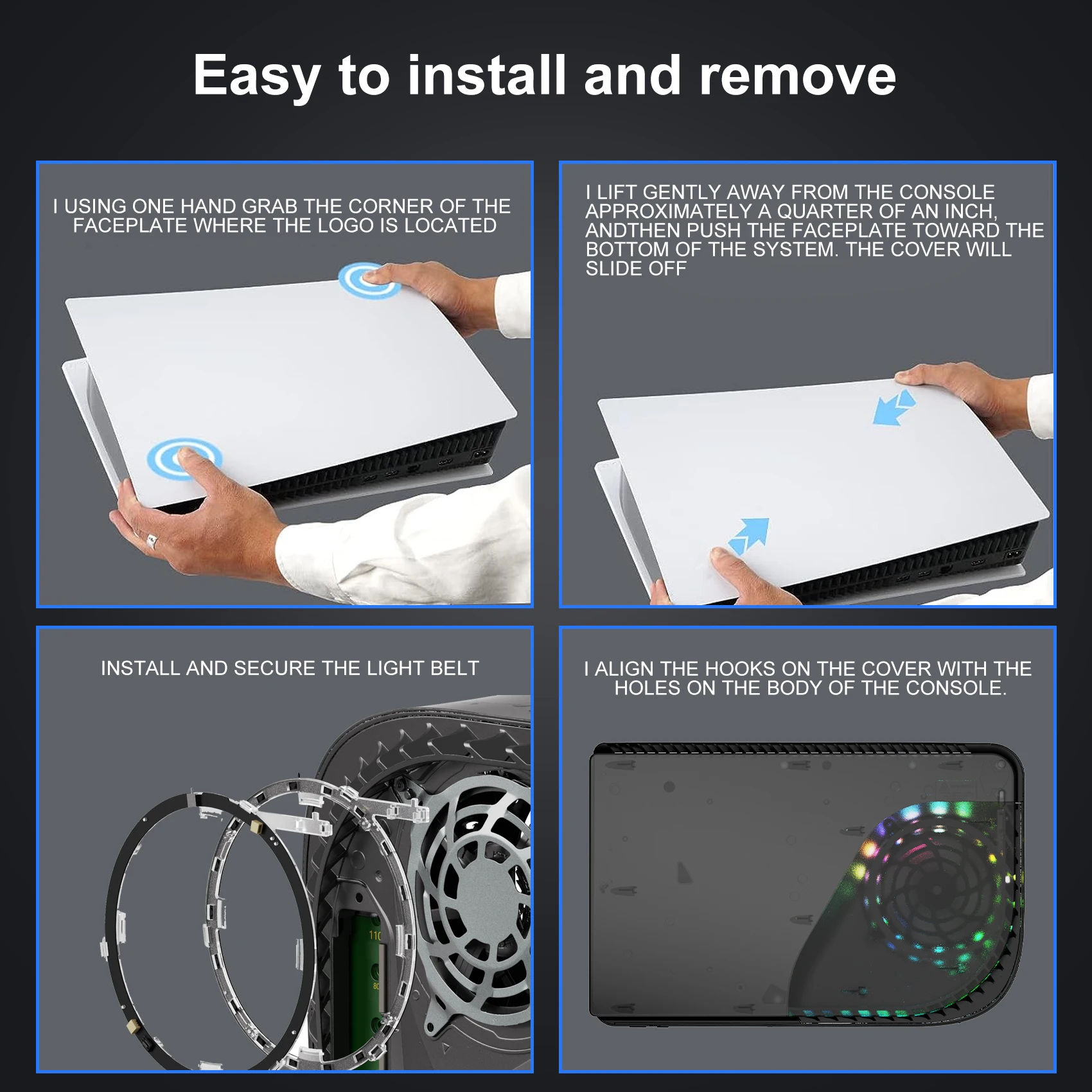 💫【Fácil de instalar y quitar】① Levante debajo de la esquina trasera de la cubierta protectora donde se encuentra el logotipo de PS5 y suelte la hebilla circular. ② Empuje la cubierta hacia la parte inferior de la consola y la cubierta se deslizará. ③ Pegue el autoadhesivo configurado en la parte posterior del anillo de luz LED y luego Fíjelo en la ventilación de la consola ps5. ④ Alinea LA NUEVA cubierta con el orificio de la unidad principal, empújala hasta la parte superior de la consola y luego la hebilla puede completar la fijación.