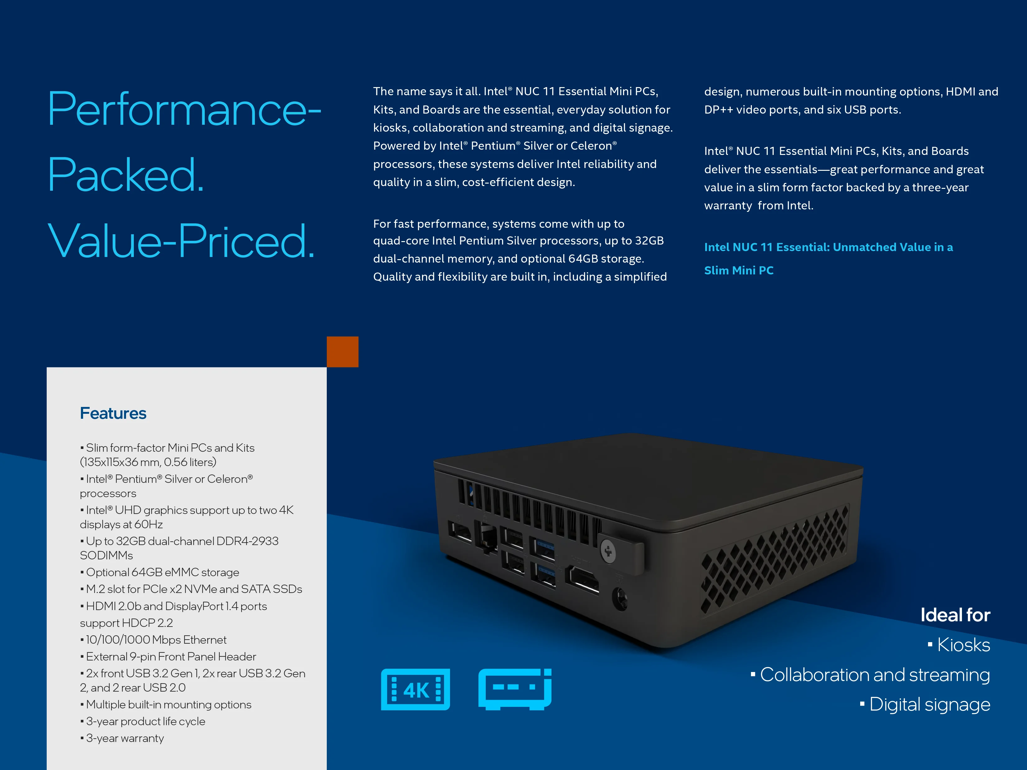 Small but powerful:This compact portable Mini PC measures only 135 x 115 x 36 mm,net weight is just 1.2 pounds,With Intel Celeron N4505 (NUC11ATKC2) 2.0 GHz - 2.9 GHz burst, 2 core, 2 thread, 10W ,Intel UHD Graphics, 450 – 750 MHz burst,support 2x4K displays