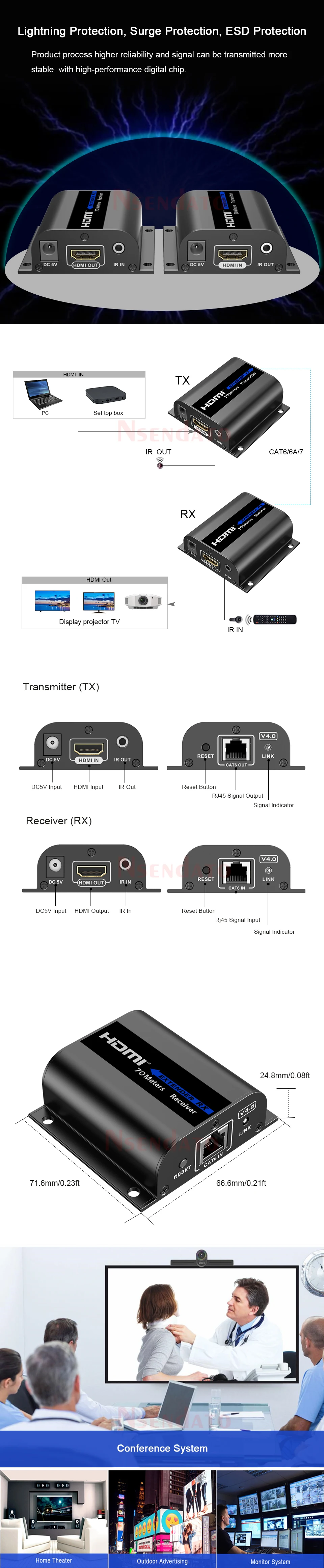 Descripción:Este extensor HDMI incluye una unidad transmisora y una unidad receptora, permite transmitir la señal HDMI hasta 70 metros con una resolución de 1080p usando un cable de red Cat6/6A/7.Adopta una configuración de conexión punto a punto, admite paso de infrarrojosCaracterísticas1.Zero latencia.2. Admite una resolución de hasta 1080p@60Hz.3. Admite cables de red Cat6/6A/7, la distancia de transmisión es de hasta 70 metros.4. Admite la función de reducción IR (20 ~ 60 KHz).5.Soporte 1080p HDR10 (YUV4:4:4:4).6. Admite passthrough EDID.7.Formatos de audio compatibles: para PCM, LPCM, DTS HD, DTS Audio8.Ajusta automáticamente los parámetros para que coincidan con diferentes cables de red yLogre el mejor rendimiento de visualización.9. Admite protección contra rayos, protección contra sobretensiones y protección ESD.10.Rango de frecuencia de retorno de IR20 ~ 60 KHz11: Admite EDID a través dePaquete:TX+RXManualExtensor de infrarrojos