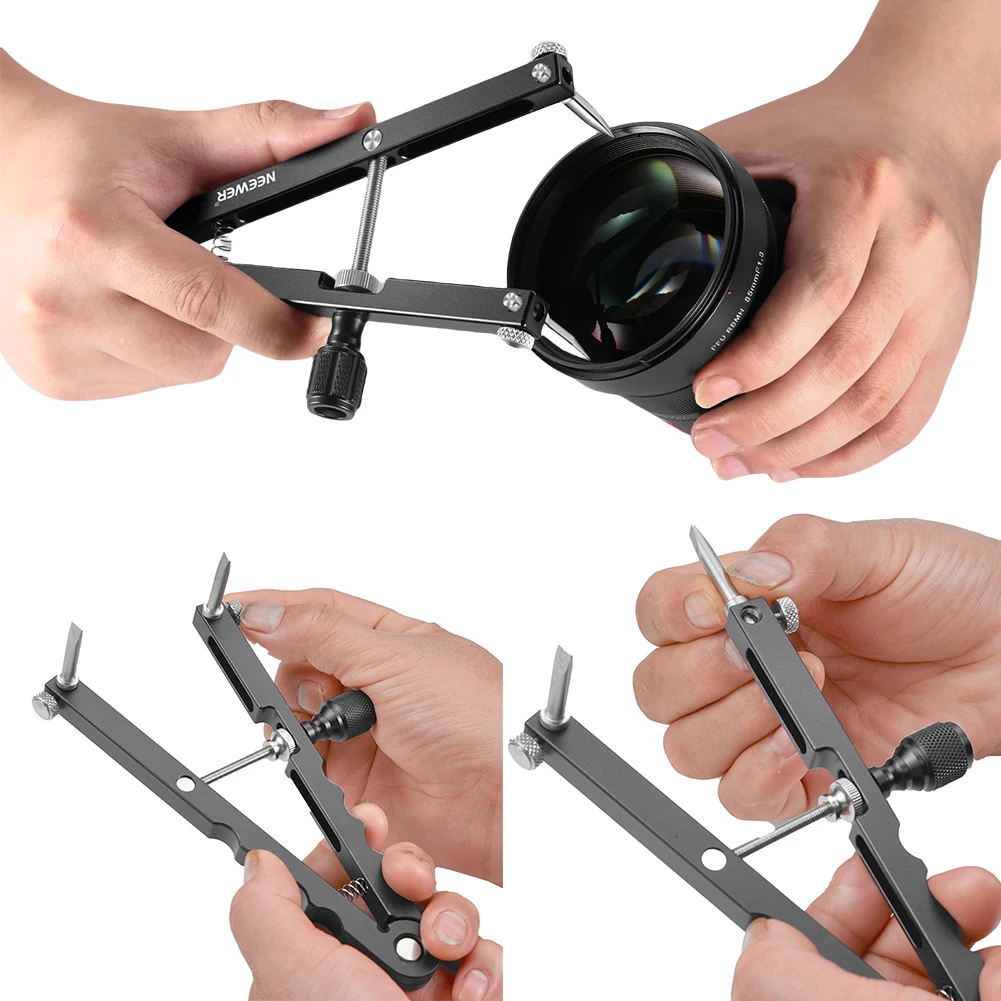 1. Rango ajustable para varias lentes:El kit de herramientas de apertura de lentes en forma de V cuenta con un rango de apertura ajustable de 16mm a 100mm, compatible con una amplia gama de lentes de cámara DSLR, oculares de telescopio, ópticas de observación de aves, y microscopios con diámetros de 37mm a 95mm.