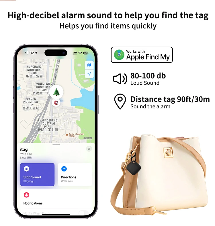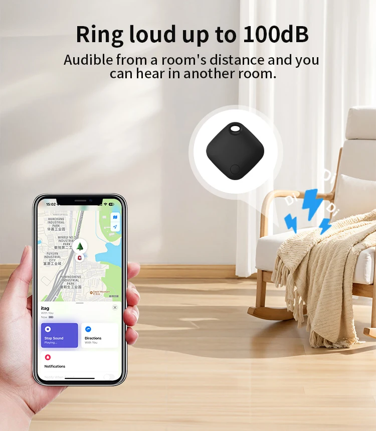 【Encuentre cerca con altavoz incorporado】El rastreador incluye un altavoz incorporado que le permite localizar fácilmente sus pertenencias dentro de un rango de Bluetooth de hasta 164 pies.Simplemente use la aplicación Find My en su dispositivo Apple para activar una alerta sonora desde la etiqueta, guiándole directamente a la ubicación de su artículo.