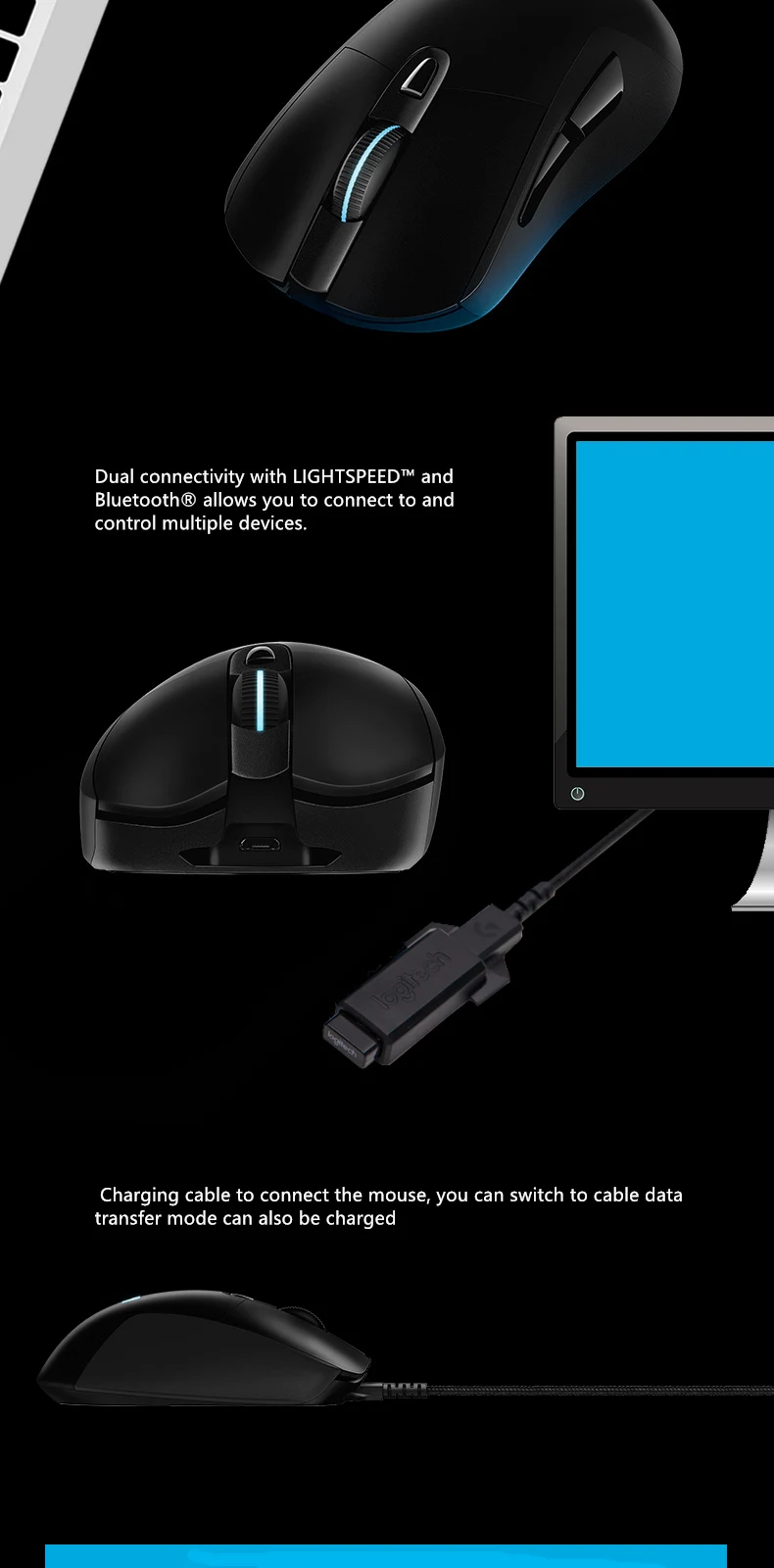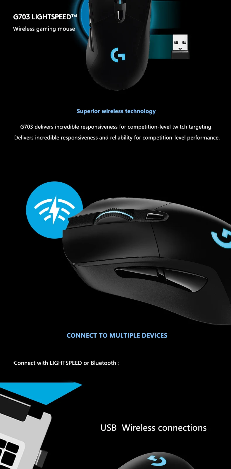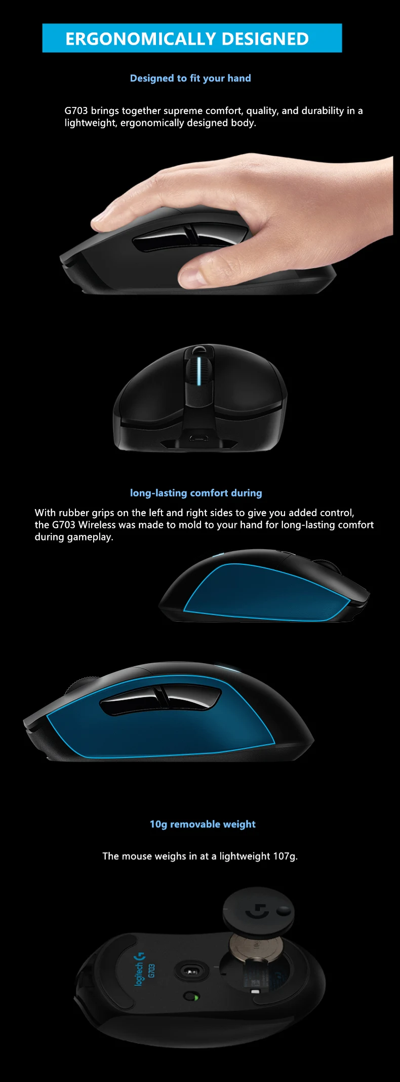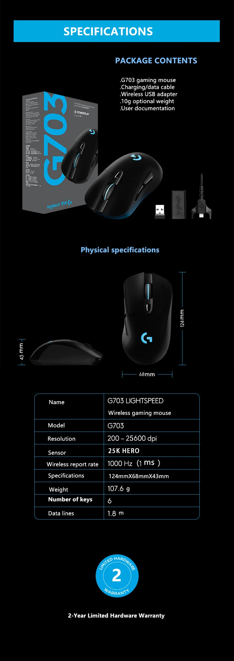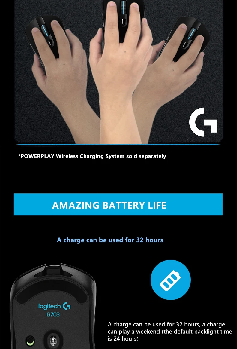 Logitech-ratón inalámbrico G703 HERO Sensor para videojuegos, dispositivo con 25600DPI, Lightspeed, POWERPLAY, Compatible con Windows, Mac OS, Chrome OS