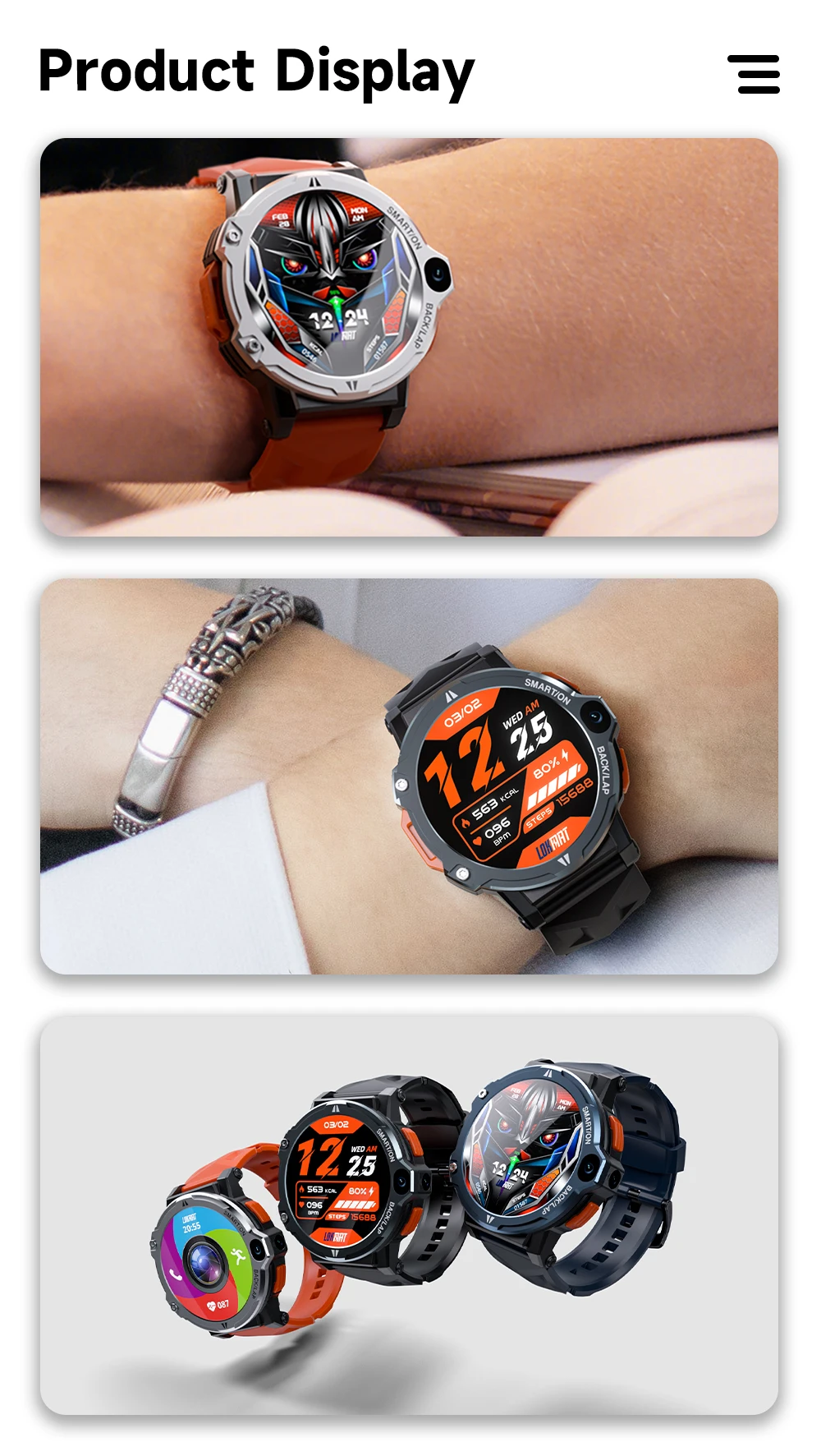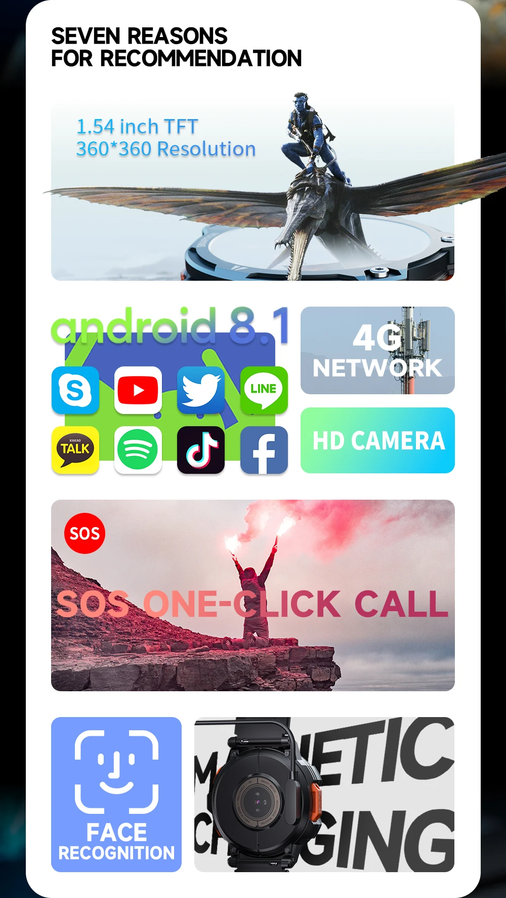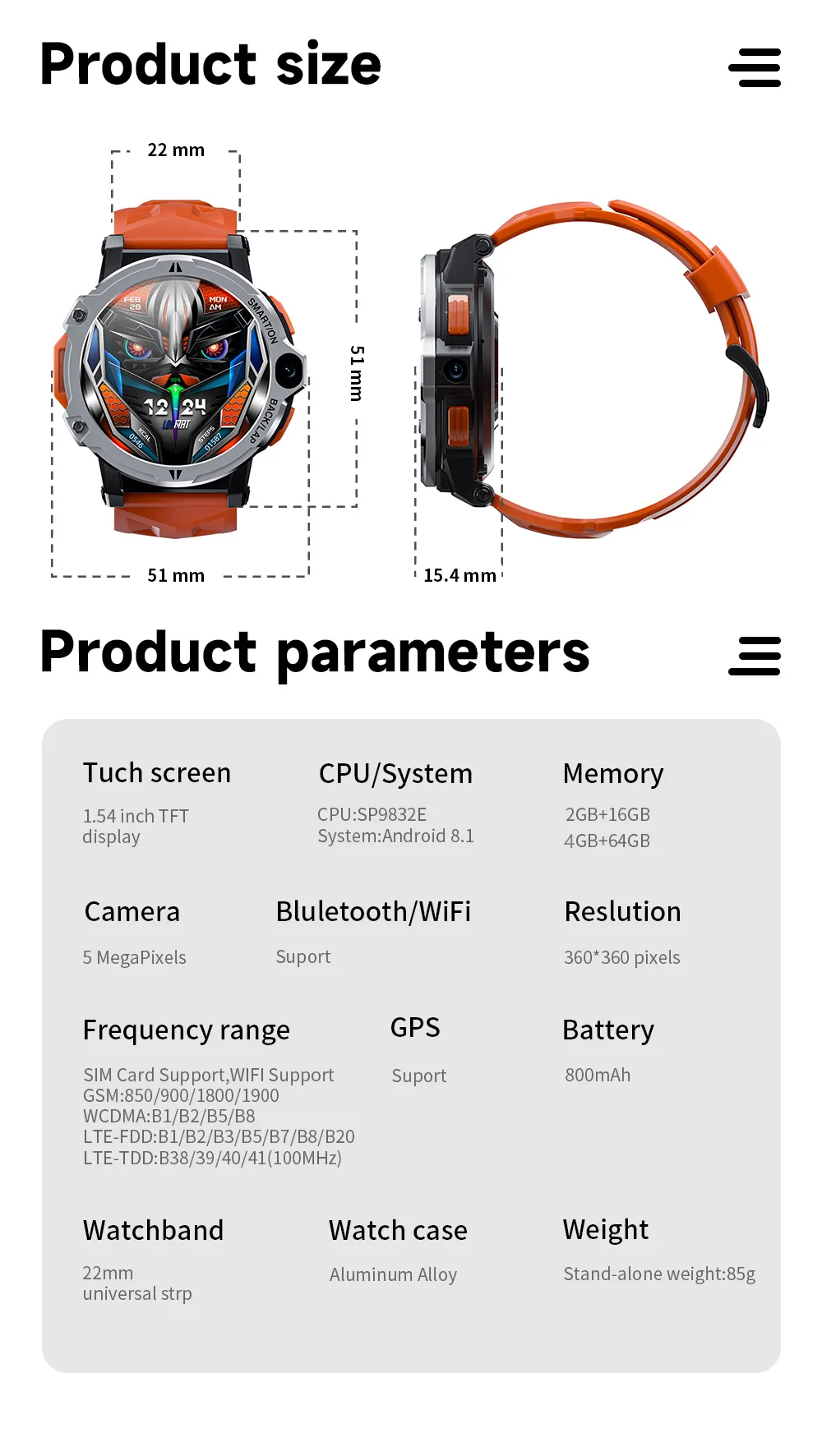 Funciones del producto: admite selección manual de idioma en el reloj, inserción de Tarjeta 4G, realizar y recibir llamadas, guía telefónica, envío de mensajes de texto, WIFI, Bluetooth, descarga de aplicaciones de terceros, reproducción, clima, conteo de pasos, videollamadas, tomar fotos, reloj despertador, calendario, calculadora, grabación, música local, Frecuencia Cardíaca, modo MULTI-deporte, medidor de presión; encontrar teléfono móvil, cronómetro, control de música, levantar la mano para iluminar la pantalla, cambiar los indicadores, etc.