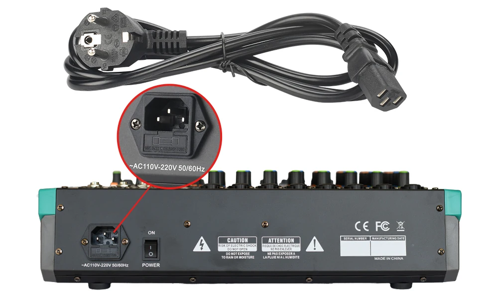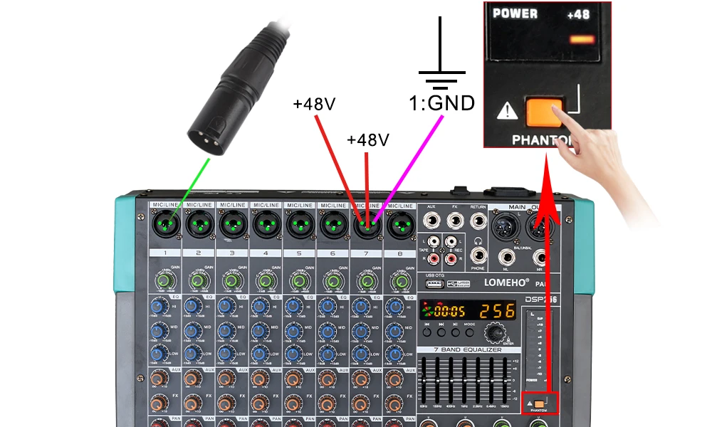 Tiene alimentación Phantom de 48V integrada, solo fuente de alimentación de 48V a toma XLR, no fuente de alimentación a toma LINE. Y cuando presione el botón 48V, 48V suministrará energía a todos los enchufes XLR.