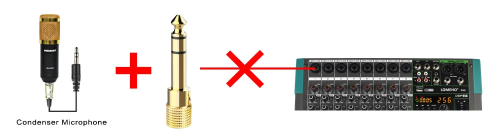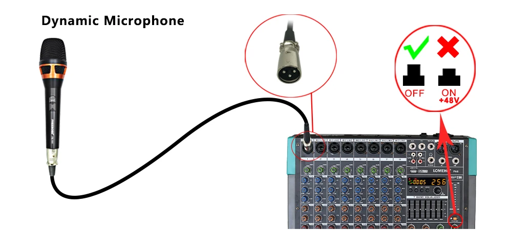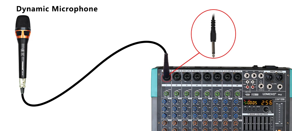 Si su micrófono es un micrófono dinámico, le recomendamos que utilice un enchufe XLR para conectarlo al mezclador, ya que el sonido será pequeño cuando UTILICE EL ENCHUFE 6,35 para conectarlo al mezclador.