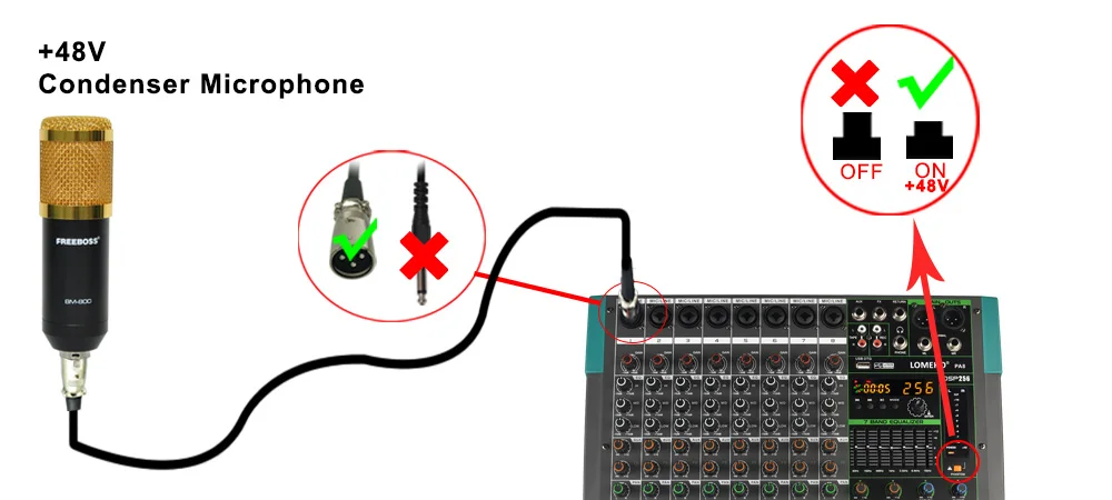 Si su micrófono es un micrófono de condensador de 48V, utilice el enchufe XLR, conéctelo al mezclador y encienda la alimentación fantasma de 48V, de lo contrario el micrófono de condensador de 48V no funcionará en el mezclador.