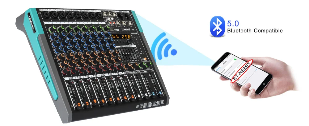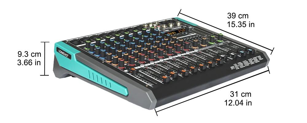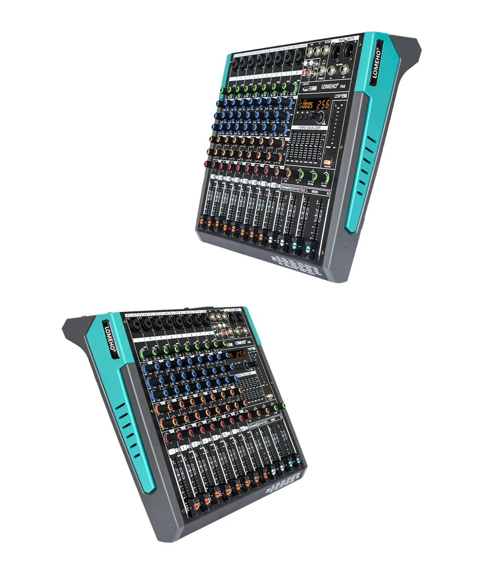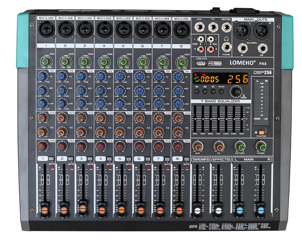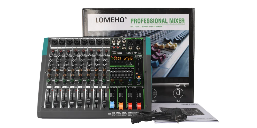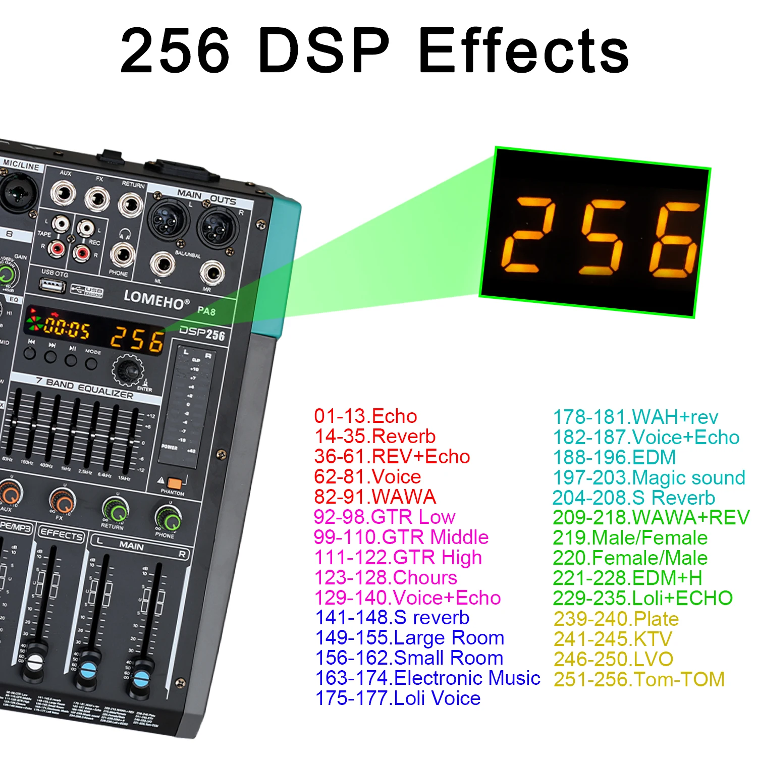 Comprar LOMEHO-Consola de mezcla de 256 efectos, mesa de sonido de 8 canales, 7 bandas EQ, mezclador de Audio Bluetooth, 48V, USB, Play, registro, DJ, controlador PA8