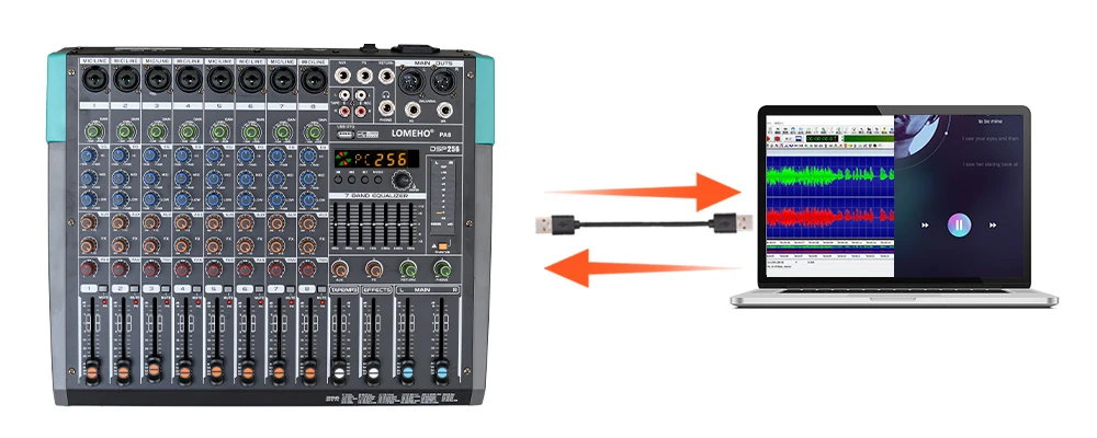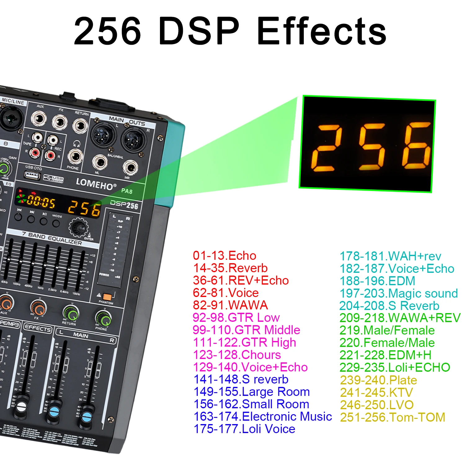 Comprar LOMEHO-Consola de mezcla de 256 efectos, mesa de sonido de 8 canales, 7 bandas EQ, mezclador de Audio Bluetooth, 48V, USB, Play, registro, DJ, controlador PA8
