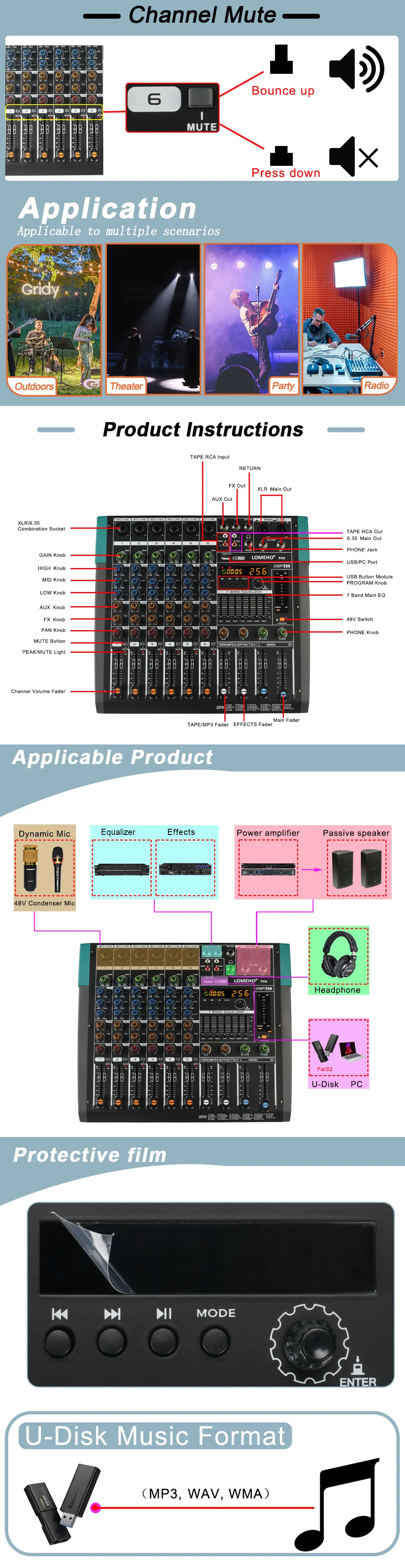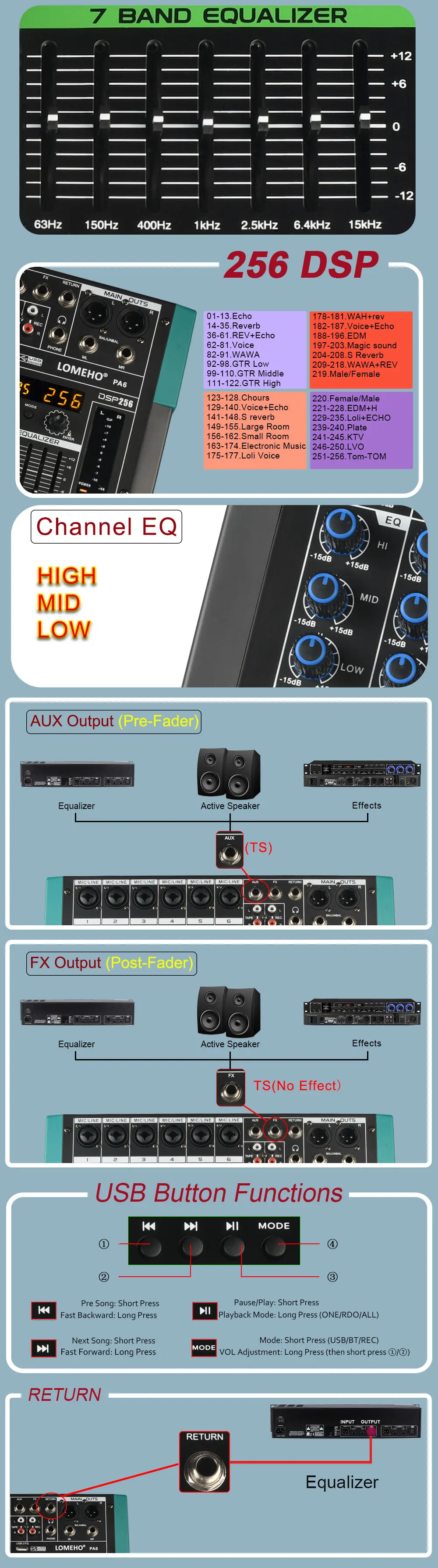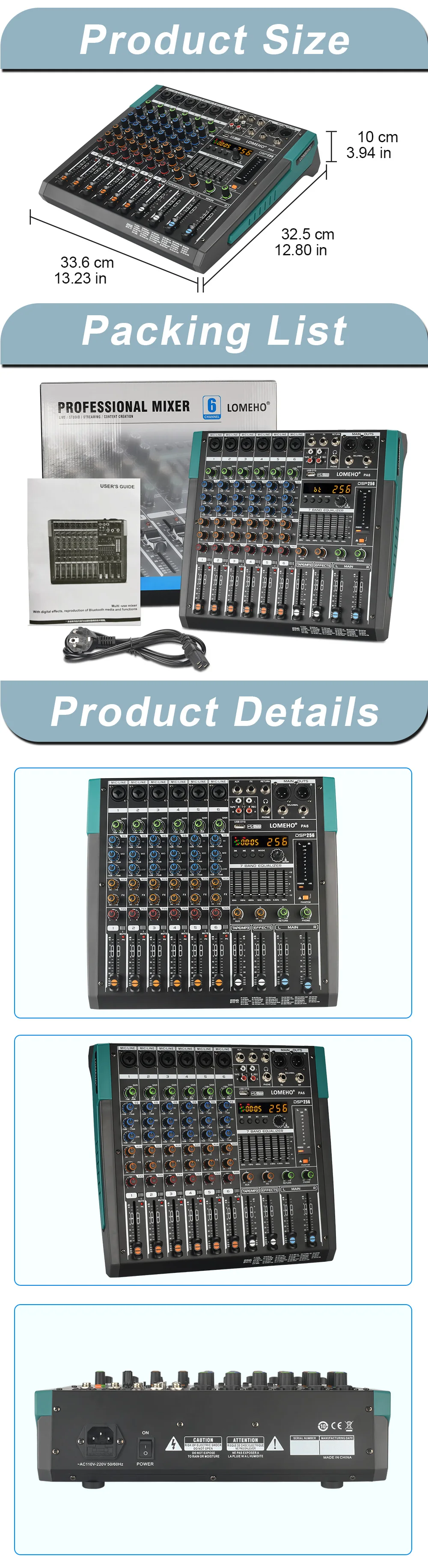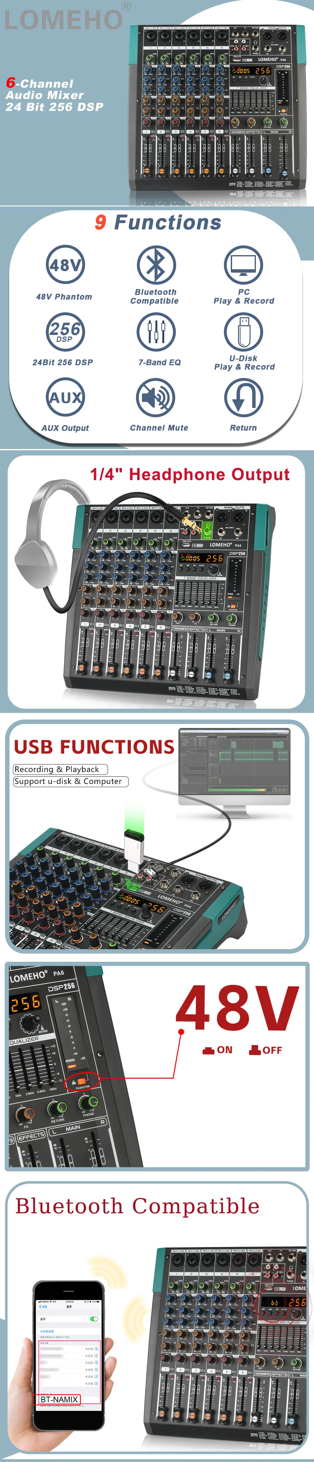 LOMEHO Consola de mezcla de 6 canales Bluetooth 256 Efectos digitales Mesa de sonido Mezclador de audio 48V USB PC Reproducir Grabación Controlador de DJ PA6